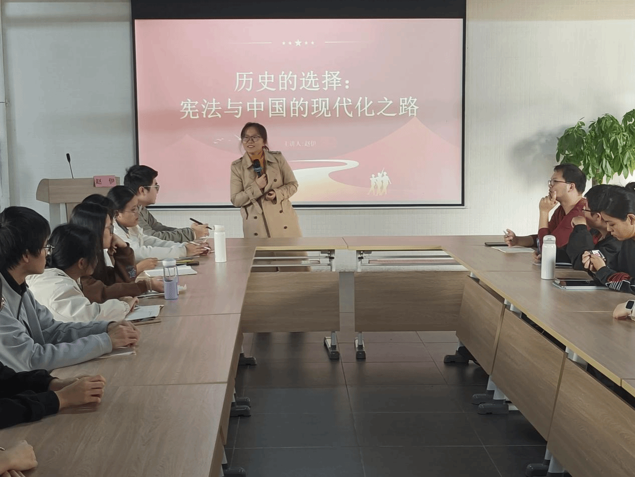 赵伊博士以《历史的选择:宪法与中国的现代化之路》为题,从我国宪法发展的历史逻辑与现实意义出发,结合中国特色社会主义法治实践,系统阐述了宪法在中国式现代化进程中的根本保障作用和时代价值。讲座内容史料翔实、案例生动、论述深刻,既有理论高度,又贴近实际,引导师生深刻领会宪法作为国家根本法的权威性与生命力,进一步增强了对“坚持依法治国首先要坚持依宪治国,坚持依法执政首先要坚持依宪执政”重要论述的理解与认同。