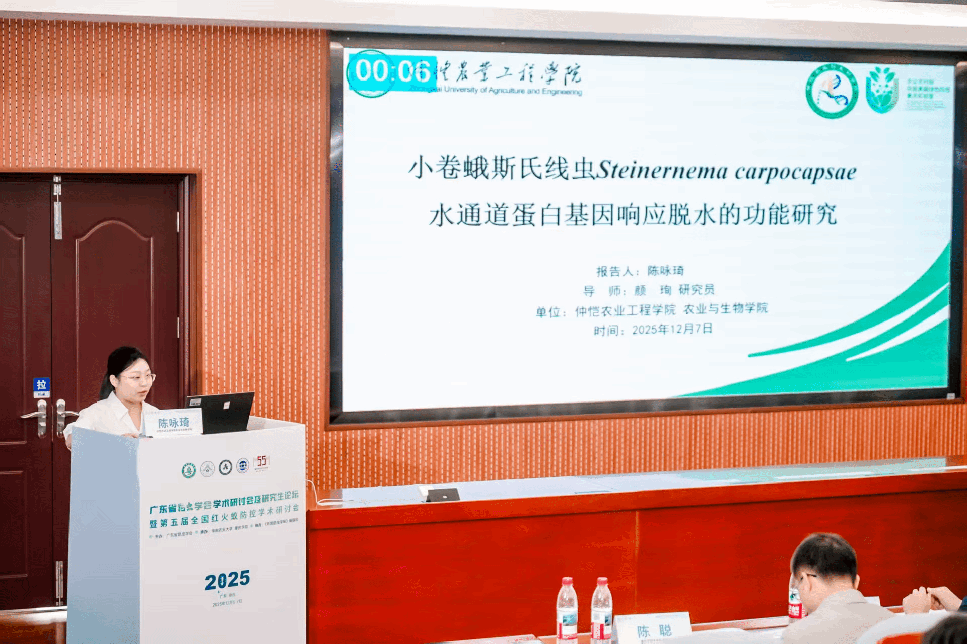 我校农业与生物学院、农业农村部华南果蔬绿色防控重点实验室颜珣研究员及农药学专业部分研究生参加会议。农药学23级研究生陈咏琦在研究生报告分会场做题为《小卷蛾斯氏线虫Steinernema carpocapsae水通道蛋白基因响应脱水的功能研究》的学术报告,荣获优秀报告二等奖。农药学24级研究生唐清凯同学提交墙报《Repellent effect of Delphinium brononianum essential oil against Solenopsis invicta Buren (Hymenoptera: Formicidae)》荣获优秀墙报二等奖。