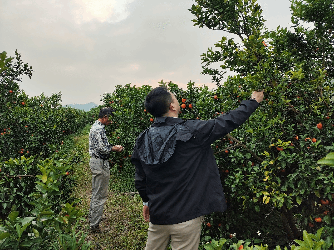 吴仲真深入田间,勘查了黄龙病的发生与分布。他现场向合作社农户及管理人员讲解黄龙病的危害特征、传播途径及防控关键。吴仲真指出,黄龙病虽具较强毁灭性,但并非不可防控,果农应树立“预防为主、综合防治”的科学发展理念。他强调,防控黄龙病必须抓住两个核心环节:一是严格防控传播媒介柑橘木虱,通过科学选药、统一防治时间、清理果园周边环境等方式,有效降低木虱数量,切断病害传播路径;二是坚决彻底清除染病植株,一经确认应立即挖除并进行无害化处理,避免病害扩散,保护健康果园。