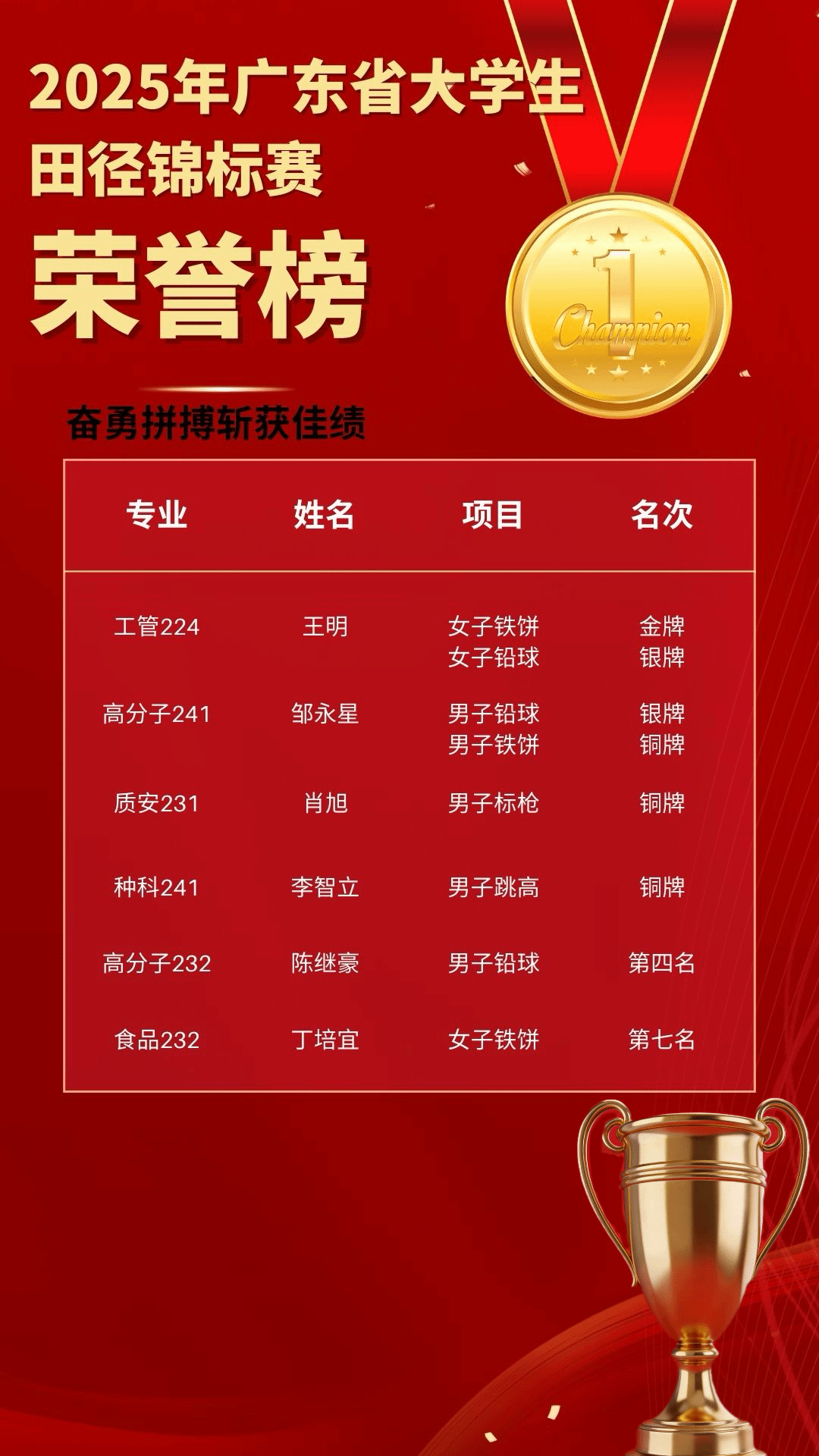 12月26~28日,由广东省教育厅主办,华南理工大学承办的广东省2025年大学生田径锦标赛于在华南理工大学(五山校区)举行,吸引了全省130所高校2334多名运动员及教练员参加比赛。我校田径队10名学生运动员,在领队李尚胥院长、教练员林锋和钟进聪的带领下,参加了本次比赛。