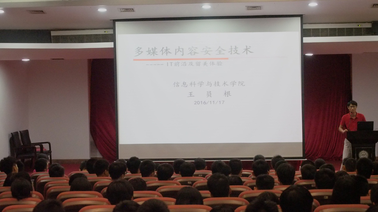为了扩大学生的国际视野和学术视野,激励学生对专业知识的学习热情, 11月17日下午,信息科学与技术学院在海珠校区学术报告厅举办由王员根博士主讲的主题为“多媒体内容安全技术”的讲座。讲座由该院党总支书记吴家培主持。该院副书记李宝菊、辅导员、所有在易班系统上抢到座位票的同学参加了此次讲座。