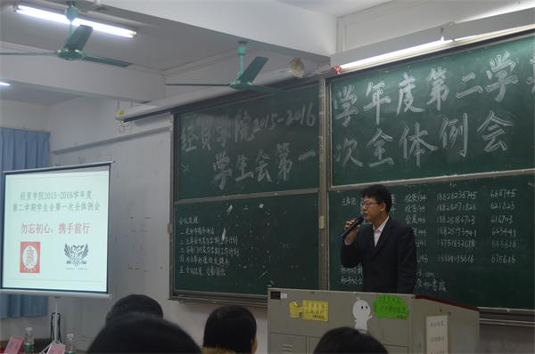 接下来,分团委书记、学生会主席和各部门代表发言,为本学期活动作工作计划和报告。希望各部门携手前行,共同进步,将经贸学院学生工作打造得更加出色!