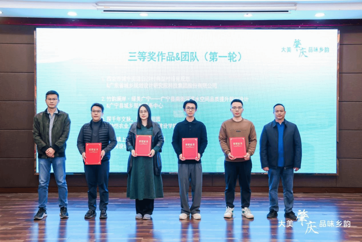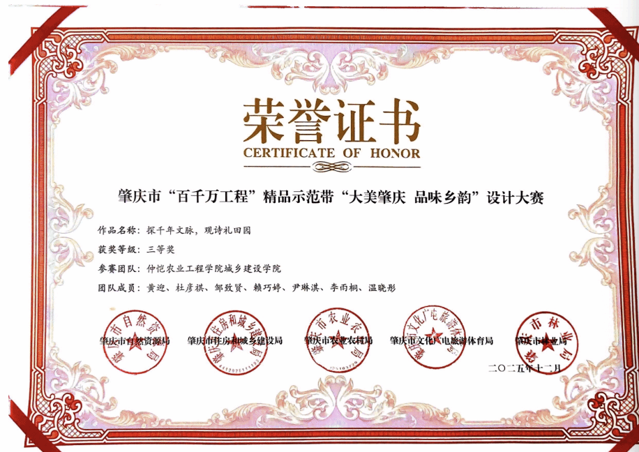 2025年5月,在省自然资源厅的正确指导下,市“百千万工程”指挥办、自然资源局、住房城乡建设局、农业农村局、文广旅体局、林业局共同举办了本次设计大赛。赛事聚焦肇庆地域特质,引导设计团队深入镇村调研、融入乡土肌理,共征集到一批兼具创意性与落地性的优秀作品,涵盖乡村规划、建筑设计、公共空间营造等多个维度,充分展现“设计赋能乡村”的创新探索。在本次大赛中,由黄迎老师带领的团队凭借出色的设计方案,在激烈的角逐中脱颖而出荣获三等奖。颁奖仪式上,主办方向获奖团队颁发了荣誉证书。随后,与会专家围绕城乡风貌设计实践进行了专题分享,进一步促进了行业内的深度交流与启发。