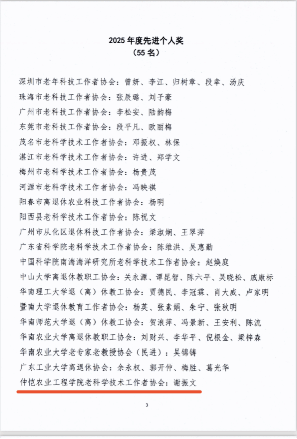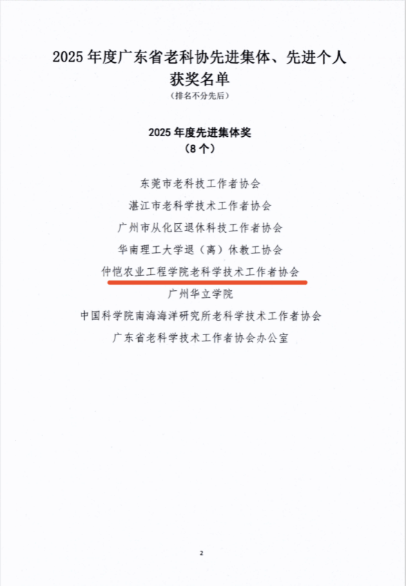 近日,广东省老科学技术工作者协会发布《粤老科协〔2026〕5号》表彰决定,我校老科学技术工作者协会(以下简称“仲恺老科协”)从全省百余个团体会员单位中脱颖而出,被授予“2025年度广东省老科协先进集体奖”,成为8家获此殊荣的单位之一。这份荣誉的获得,既是对我校老科协“退而不休、科技报国”生动实践的肯定,也标志着学校银龄人才工作再上新台阶。