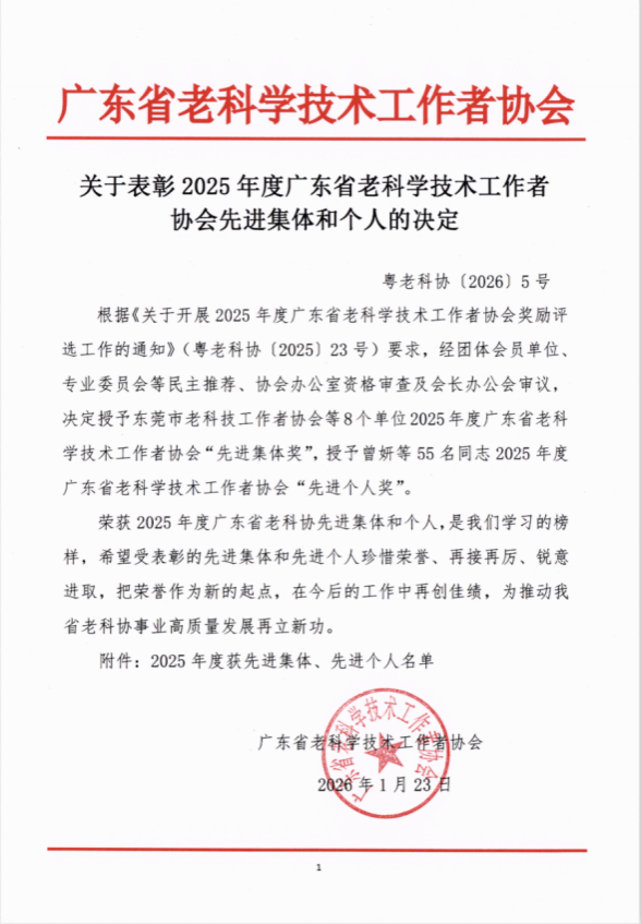 此次获评“先进集体”,是我校老科协继2024年获中国老科协“科学技术奖”之后的又一突破。面向2026,我校老科协将紧扣“十五五”开局和粤港澳大湾区国际科技创新中心建设,持续深化“银龄行动”,在决策咨询、乡村振兴、科学普及、助企创新等领域再立新功,为广东在推进中国式现代化建设中“走在前列”贡献仲恺银龄智慧与力量。