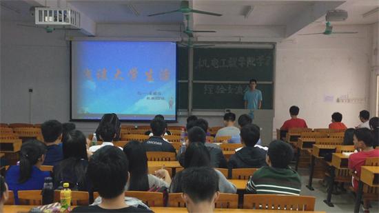 在白云校区杨钊杨勋楼103室,2014-2015学年国家奖学金获得者机械123班谭开展同学以《如何读大学》为主题,分别从自觉自省、自律自强、自我认同三个方面给大家描绘了走向成功的“加速度曲线”,提出了“课前预习+课堂认真听讲+课后复习”的学习路线,并提出要养成主动学习的习惯。他建议同学们多参加校内外专业技能竞赛,提高自身的专业技能,平时要加强体育运动,处理好人际关系,多结善缘,广交朋友。同时,他建议同学们结合自身的兴趣爱好、性格特征、能力特长,尽早确立职业发展目标和职业发展路径,制定学习实施计划。