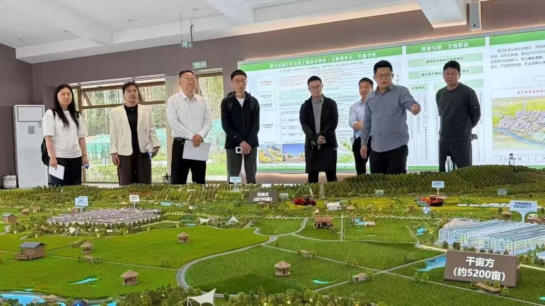 调研组首站抵达大塘镇全域土地综合整治展示中心。在听取相关负责同志系统介绍后,调研组重点交流学习了曲江区以全域土地整治为牵引,推动乡村系统性重塑的规划与实施经验。随后,调研组来到历山“未来社区”选址点进行实地考察。通过参观未来社区样板房,调研组直观了解了社区的设计理念、功能配置与人居环境标准,并就相关配套政策、建设模式与实施安排,进行了深入交流与探讨。调研组还走访了九龄粮仓文化创意产业园,详细了解其以文化赋能乡村、以旅游激活空间的总体布局思路。双方还就如何通过科技手段赋能农产品加工、提升产品附加值、拓宽市场渠道等具体举措交换了意见。