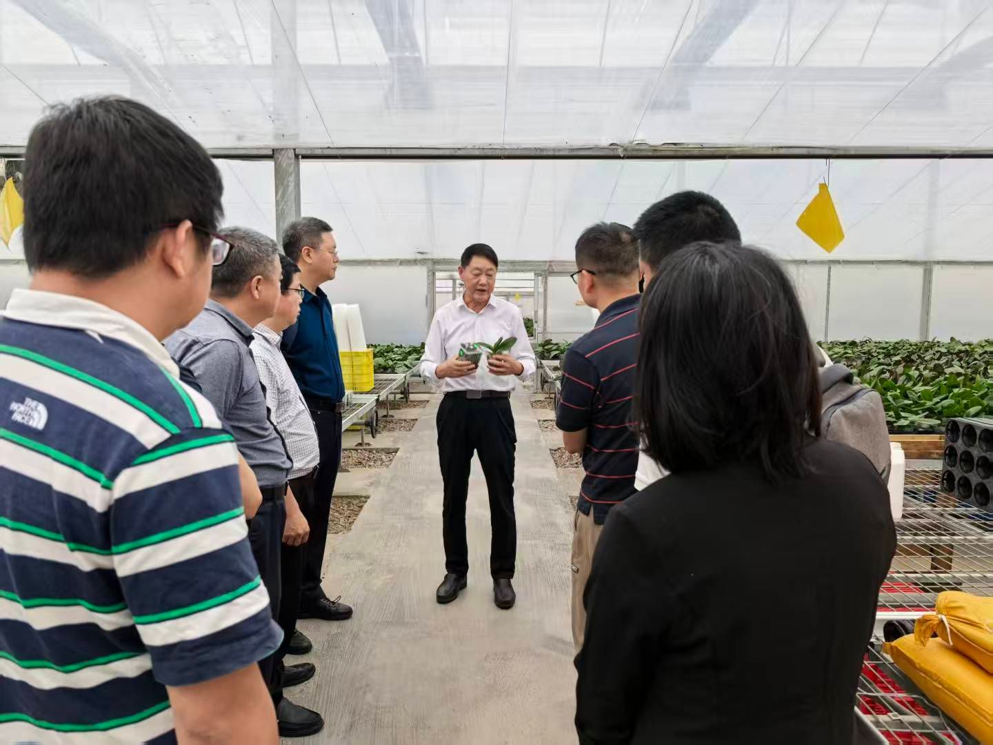调研组一行首先到访广州花卉之都农业有限公司,深入了解蝴蝶兰生产与销售情况,实地考察生产现场,围绕蝴蝶兰浇水管控、移苗作业、打包发货等难点进行了交流。随后,调研组前往马岭观花植物园,实地参观园区设施建设并开展座谈交流。