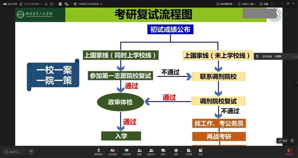 刁增辉围绕复试调剂基本流程与核心规范开展专项指导,他鼓励同学们保持良好心态,认真准备,充分展示自身优势。同时,刁增辉也欢迎广大考研学子积极考虑调剂回校深造,并介绍了学院研究生导师的师资力量和研究方向,为同学们提供了更为清晰的报考选择参考。