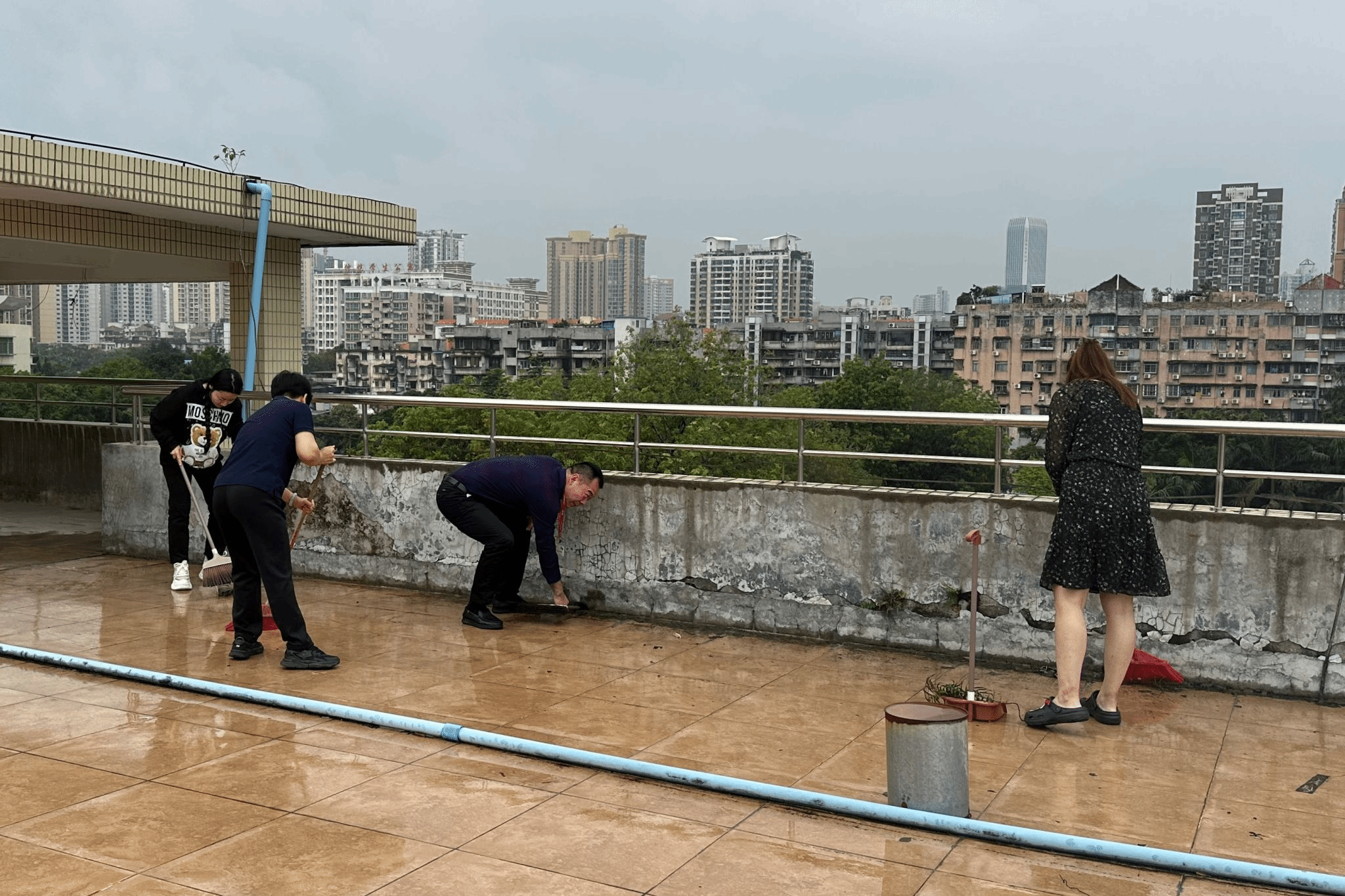 3月30日,雨势未停。党员们主动请缨,重返楼顶,全面排查并疏通所有排水管道,清理淤泥落叶,加固隐患接口,筑牢校园防汛安全线。