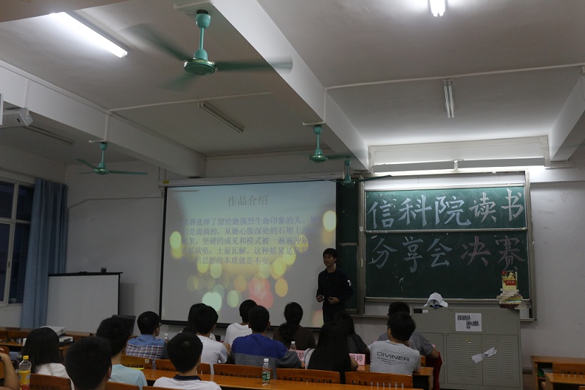 比赛首先由一号选手马梓鑫带来柴静的《看见》,他结合自己的经历来讲诉了这本书带给他的感受,并解读了书中一些让他记忆深刻的句子,把同学们带进了他所营造的氛围里。二号选手陈景平分享的是《读大学,究竟读什么》,带来了一些“另类”的思想。三号选手倪培燕从另一个角度去诠释了青春,《因为痛,所以叫青春》让同学们对青春有了不一样的认识。接着是选手赵超楠,给我们带来了张嘉佳的《让我留在你身边》——一个关于狗狗的温暖故事,充满着正能量。最后是选手黄武华分享郁达夫的《沉沦》,伴着轻柔的音乐,他声情并茂地介绍了作者生平经历以及作品带给他的思考,幽默风趣的语言也不时引起了同学们的笑声。