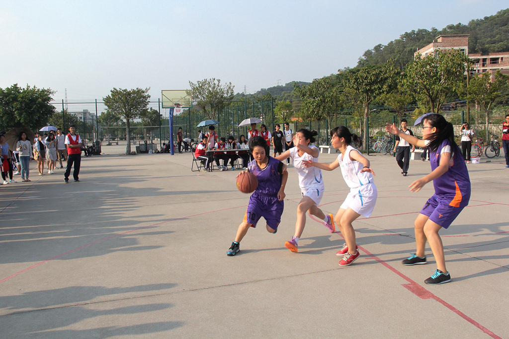 在“香凝杯”的赛场上,比赛以半场赛的形式进行。“香凝杯”揭幕赛由外国语学院(以下简称“外院”)对阵园艺园林学院(以下简称“艺林学院”)。 比赛刚开始,外院9号球员在对手的严防死守下运球上篮得分,取得本场比赛“开门红”,赢得场下观众阵阵欢呼。随后,双方队员连连犯规,其中,外院两罚全中,再斩2分。艺林学院10号球员侧身投球得分,为学院拿下2分。半场结束,外院以17:3的比分遥遥领先。