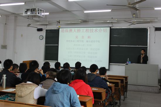 12月12日下午,城市建设学院在教学楼B401举办“港珠澳大桥工程技术介绍”专题讲座,教授级高级工程师吴全科老师应邀主讲,城市建设学院党总支副书记李玲、辅导员陈彦博老师以及相关专业学生120余人参加讲座。