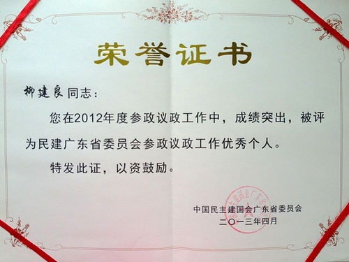 近日,根据《民建广东省委会关于表彰2012年度参政议政工作先进集体、优秀个人的决定》(粤建发字[2013]3号)决定,我校柳建良教授(民建广东省委仲恺支部)被授予“2012年度民建广东省委会参政议政工作优秀个人称号”。
