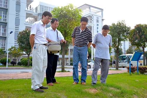 刘少春局长一行视察白云校区的红火蚁灾害情况之后表示,白云校区红火蚁灾害比预想中严重,每亩草坪红火蚁密度较大,平均每十平方米有一窝。按此形势,必须抓紧根治,以确保师生安全。刘局长当即向随行的同事下达处理工作,安排相关部门给药,及时治理。