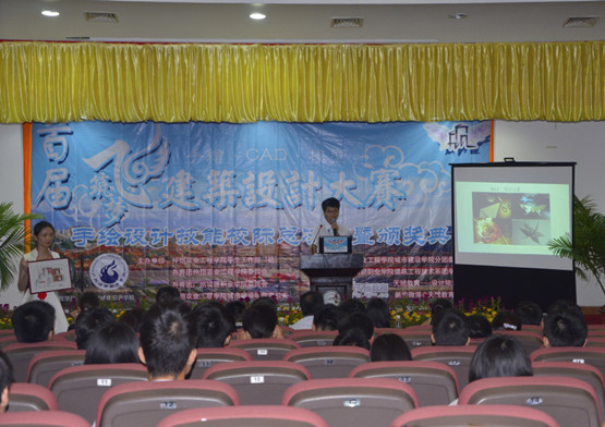 在一段介绍入围作品的视频及题为《建筑人的中国梦》的朗诵后,进入选手作品展示与讲解环节,十组选手通过现场5分钟PPT演讲展示自己的作品,并通过大众评委现场评分及评委老师点评作品来赢得相关分数。在演讲PPT的环节中,3号团队以“动静相依,音筑梦飞”为设计理念,设计了都市小苑“音飞扬”公园,人性化和全面的功能分区结合“动——静——动”的分布,在繁忙都市中能营造出轻松的休闲氛围,赢得大众评委给出的9分高分。5号团队的设计作品为欧式别墅,大量运用园林与建筑的结合,各类效果图及手绘将选手的“筑梦”想法表达得淋漓尽致,赢得评委的好评。7号选手的作品为红色图书馆,大众评委只给出4分,但评委认为其设计逻辑性强,技法娴熟,同样获得评委的青睐。8号选手演讲主题为“双向”筑梦飞,说明了筑梦飞需要有准备,筑梦飞需要有方向,通过“双向”筑梦飞转变为“双向”建筑,重点划分为纵向和横向来展示出自己的休闲广场。8号选手凭借“双向”获得了本场第二位高分。