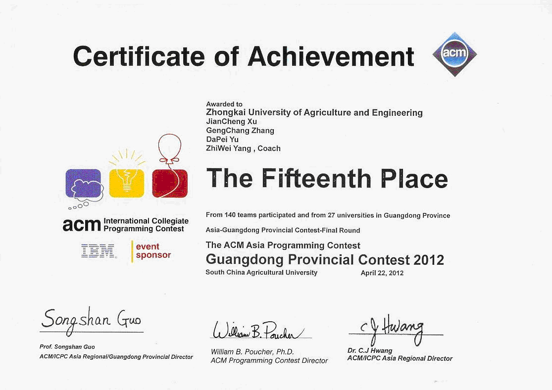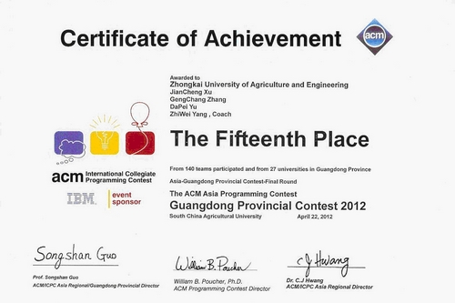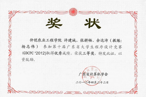 第十届广东省大学生程序设计竞赛在华南农业大学举行。来自中大、华工、暨大、广外、华师等27所高校的140支队伍参加了比赛。在学校和教务处的大力指导和支持下,计算科学学院杨志伟老师带领2支队伍参赛。其中信计091许建城、信计101张耕畅、电子092余达沛同学获三等奖。我校在27所高校中排第15名,获得组委会嘉奖。