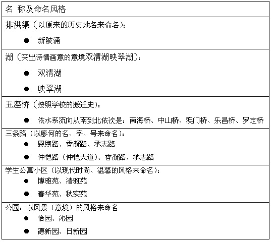 根据初评会议的决议,桥根据学校搬迁史来命名,路以廖仲恺何香凝先生的名、字、号来命名,学生公寓体现现代、时尚和温馨,湖突出诗情画意的意境,公园以风景(意境)的风格来命名,渠的命名则需尊重历史地名。命名评审小组成员根据初评会的决议与网上投票情况,分别对桥、路、学生公寓、公园、湖和渠的命名进行讨论并以举手投票的方式评选出命名对象的一至两套作品。