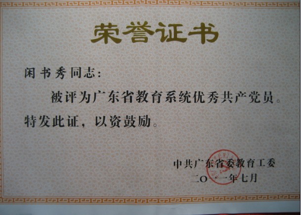 近日,闲书秀同学被中共广东省委教育工作委员会授予“广东省教育系统优秀共产党员”的称号。闲书秀同学是机电工程学院机械081班学生,机电工程学院学生党支部委员,他在“创先争优”活动中表现突出,在学生中树立了自强不息、德智体全面发展、无私奉献、默默服务集体与社会的先进典型。他今年被评为我校6名优秀学生党员之一,并经学校推荐成为我校唯一一名在省教育系统受表彰的优秀学生党员。