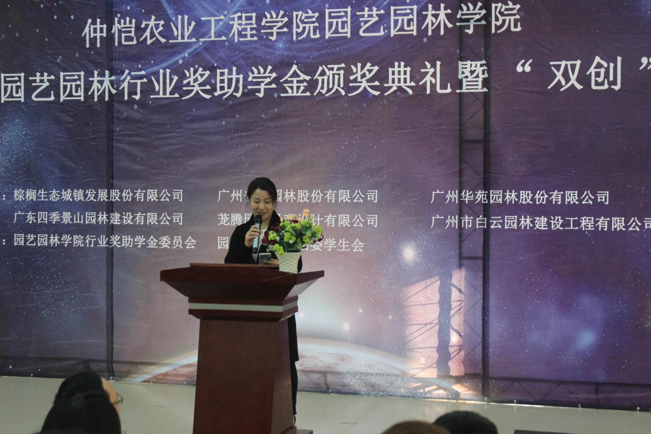 石利刚宣读《关于颁发2017年仲恺农业工程学院园艺园林行业奖助学金的决定》,本次行业奖助学金项目包括棕榈奖学金、普邦园林精英奖学金、华苑创意英才奖、四季景山奖学金、茏腾园林奖学金及白云园建助学金等六个大项,十八个小项,共142位同学获奖励和资助。获奖学生代表郑增武分享了自己的心得体会,表示将努力学习并以优异成绩回报企业和社会。
