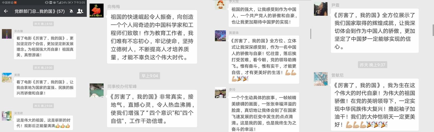 观影结束后,大家都被片中展现的奋发向上、开拓进取的中国精神深深感染,并纷纷在党总支微信群发表观后感,表示作为一名中国人,强烈地感受到了对祖国的认同感、归属感、安全感、自豪感;作为一名共产党员,深刻地认识到党的十八大以来取得的巨大成就,意识到自己肩负的使命和责任。决心要按照党的十九大擘画的宏伟蓝图和发展方略,拥抱新时代,奋进新征程,撸起袖子加油干,为决胜全面建成小康社会、实现“两个一百年”目标和中华民族伟大复兴的中国梦不忘初心、砥砺前行。