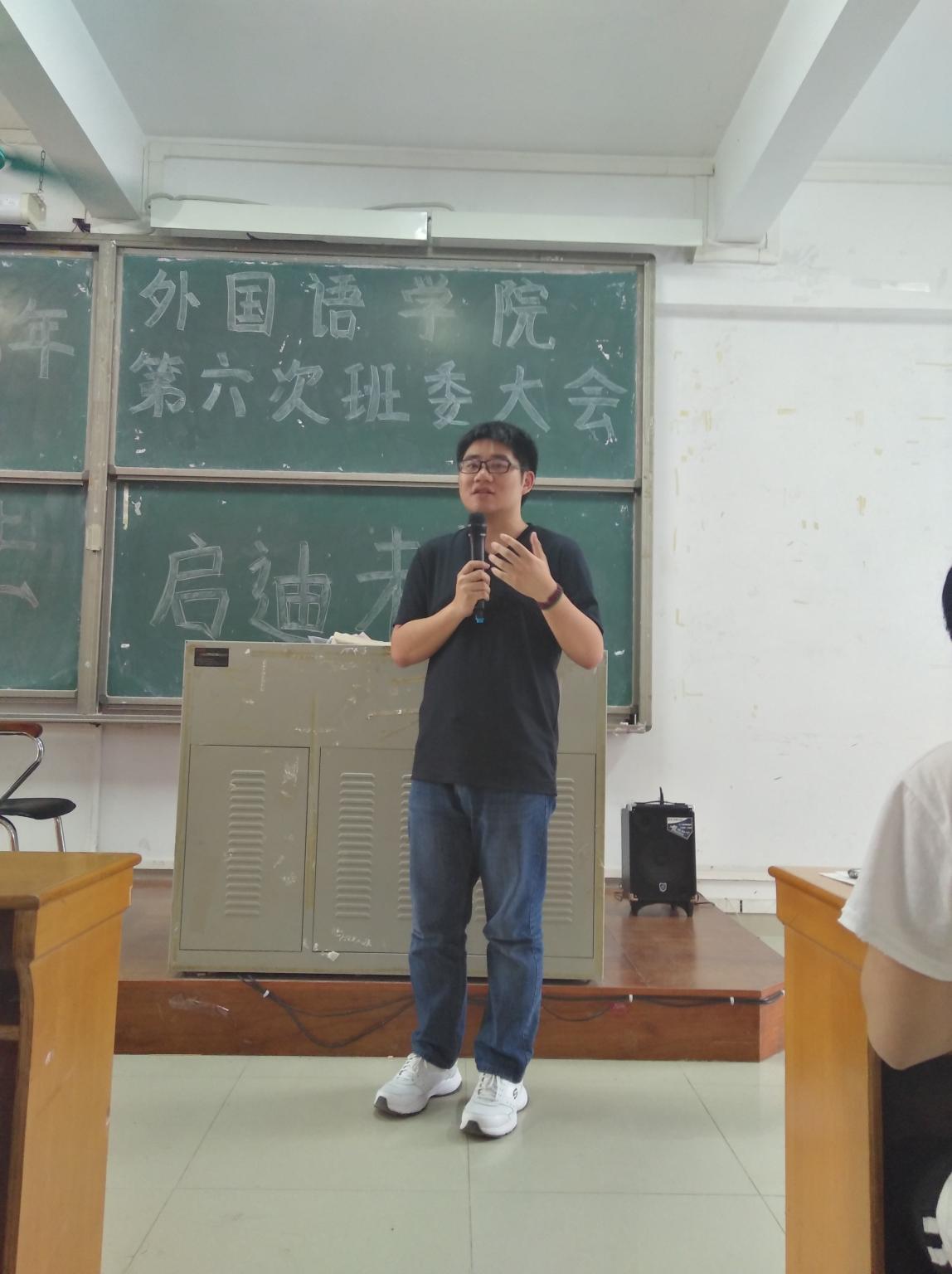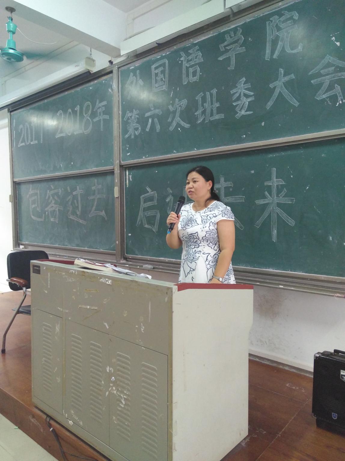 5月28日下午,2017~2018年外国语学院第六次班委大会在杨钊杨勋楼310课室顺利召开。本次会议主题为“包容过去,启迪未来”。出席本次会议的有外国语学院党总支副书记柴明勤,辅导员邓永权以及学生会主席罗紫茵,学生会副主席刘婷婷。外国语学院2015、2016、2017级全体班委成员参加本次会议。