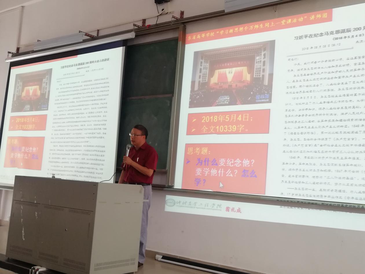 根据广东省教育厅《关于组织开展“学习新思想千万师生同上一堂课活动”的通知》要求,围绕习近平总书记在纪念马克思诞辰200周年大会上与北京大学师生座谈会上重要讲话精神的丰富内涵和精神实质,面向广大师生讲清楚总书记重要讲话的学理支撑和理论蕴涵,讲清楚新时代教育工作的使命担当和广大师生的责任要求,6月20日下午,党委学生工作部、马克思主义学院在白云校区D2报告厅共同举行“学习新思想千万师生同上一堂课”活动。党委学生工作部部长李伟东教授、马克思主义学院党总支书记翁礼成教授分别为师生授课。此次活动由马克思主义学院副院长秦抗抗副教授主持。