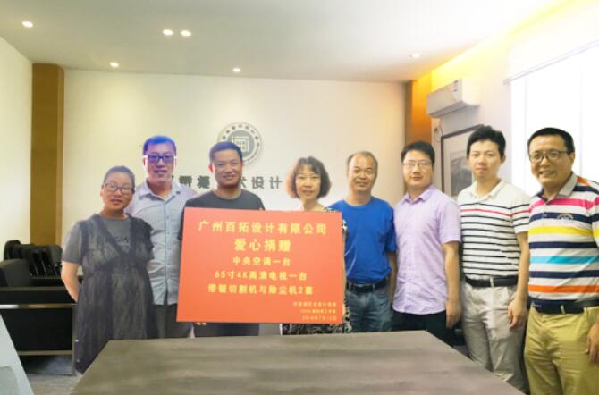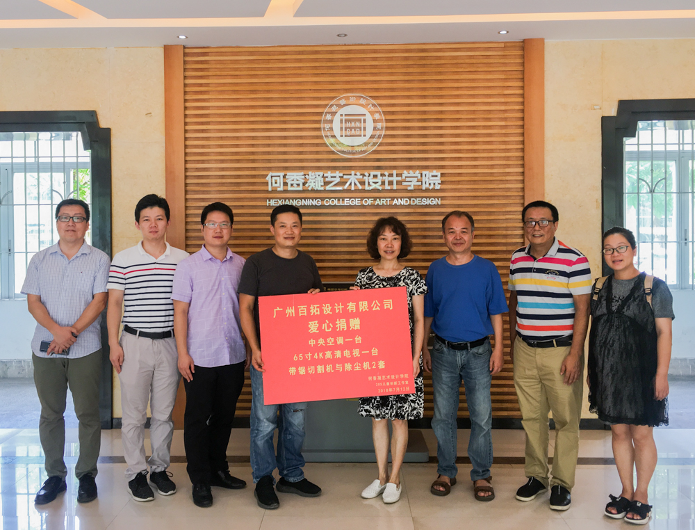 何香凝艺术设计学院响应“十九大”号召,深化“校企合作、产教融合”,展开“开展本科教育思想观念大讨论”,促进了教师教改积极性。日前,在广东省生产力促进中心的引荐下,由产品设计系翟橙老师联系“广州百拓设计有限公司”,该公司向产品设计系捐赠了中央空调一台、65寸4K高清电视一台、带锯切割机和除尘机各2套,总值约2万元的设备。7月12日上午在何香凝艺术设计学院举行了捐赠仪式。何香凝艺术学院党总支书记邓慧琳、副院长刘太雷、产品设计系主任杨汝全、曹小琴副主任、翟橙老师、广州百拓设计有限公司总经理唐四平以及广东省生产力促进中心陈茂清与刘文兵两位工程师一起出席捐赠仪式。