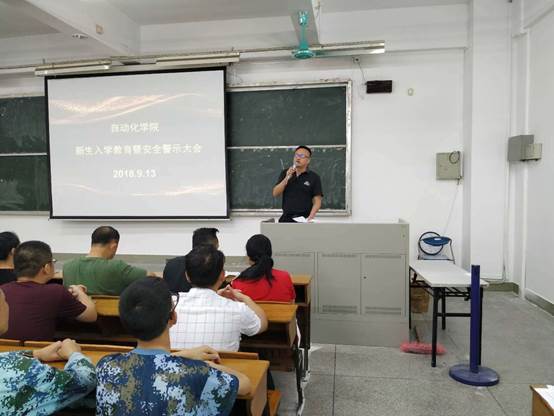 9月13日上午,自动化学院在海珠校区教学楼B301室召开新生入学教育暨安全警示大会。参加本次会议的有自动化学院党总支书记李金霞、院长王克强、党总支副书记黄毅、副院长唐宇、专任教师、教务员、辅导员、班主任和2018级全体新生等。会议由自动化学院党总支书记李金霞主持。