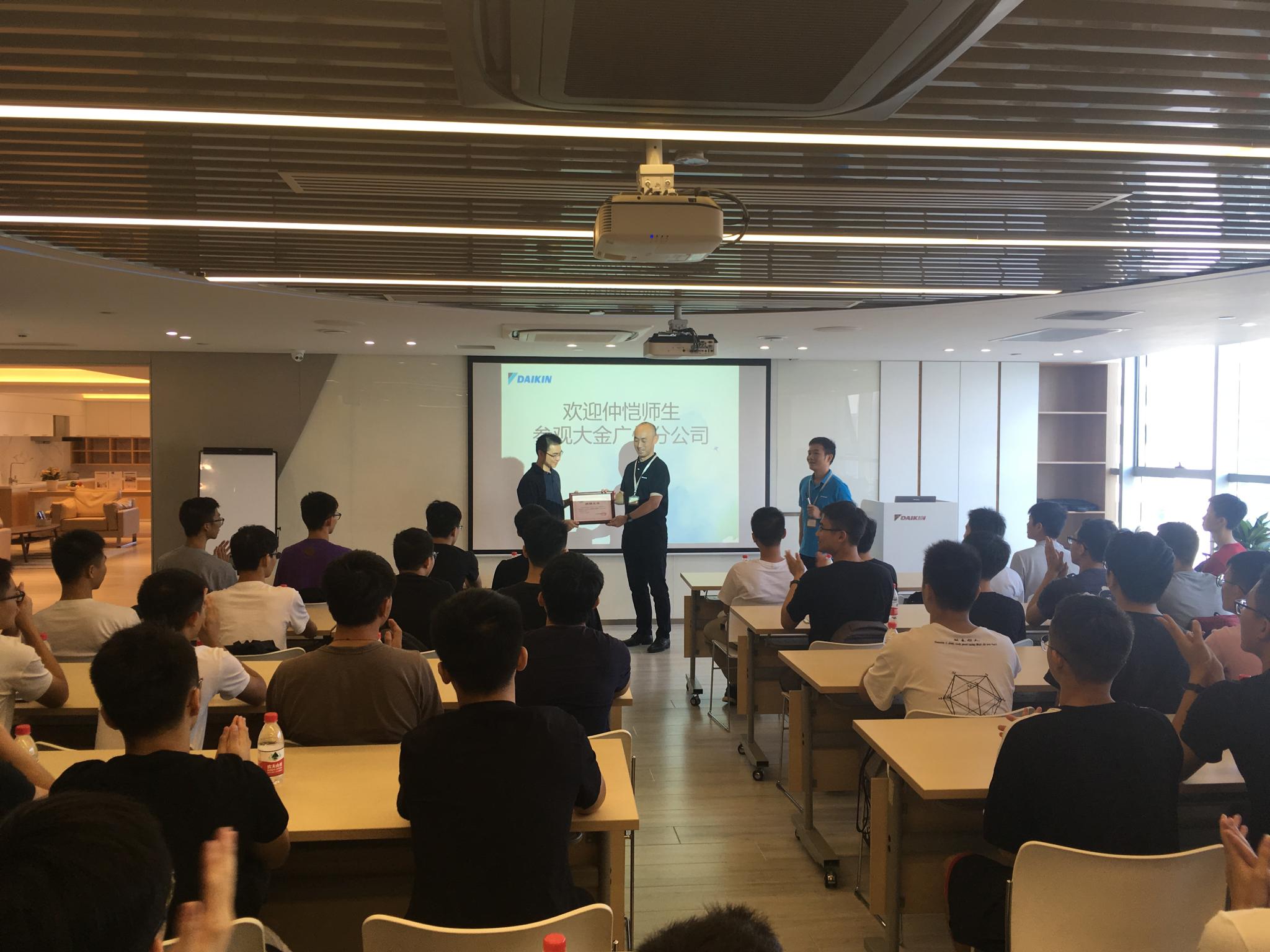 参观结束后,弥田健太郎部长代表大金广州分公司向机电工程学院赠送“涡旋式压缩机解剖教学模型”,并颁发捐赠文书。最后,大学生创新创业促进中心副主任张日红老师代表学院创新创业中心讲话,他首先感谢大金公司为我院师生提供难得的学习机会,在参观过程中,大家不仅感受到大金公司的文化氛围,直观地了解了大金空调的设计理念和最新技术,还增强了同学们在机械设计、机械制作、能源动力工程等专业领域的学习兴趣和钻研意识,希望同学们能够继续增强“匠人意识”,将大匠精神融入到专业学习和以后的工作中。