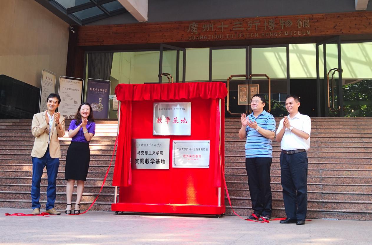 9月30日上午,马克思主义学院广州十三行博物馆实践教学基础揭牌仪式在广州十三行博物馆门前广场举行,马克思主义学院院长蔡立彬教授(右一)和广州文化公园副主任、广州十三行博物馆馆长孙莉女士(左二)等亲自为实践基地揭牌,李增添、徐满泽老师带领47名学生参加了仪式并在仪式结束后进行了现场参观教学。