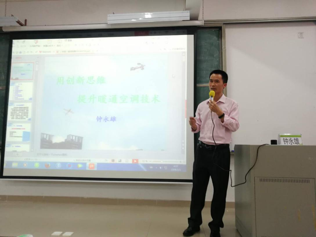 钟永雄总经理报告的主题是《用创新思维提升暖通空调技术》,他从创新思维、技术创新和专利技术的基本内涵展开,结合暖通空调实践领域中的诸多创新案例,着重对创新的动力源、创新的原则和方法进行了讲解。在座师生以饱满的热情聆听了报告,现场互动气氛活跃。