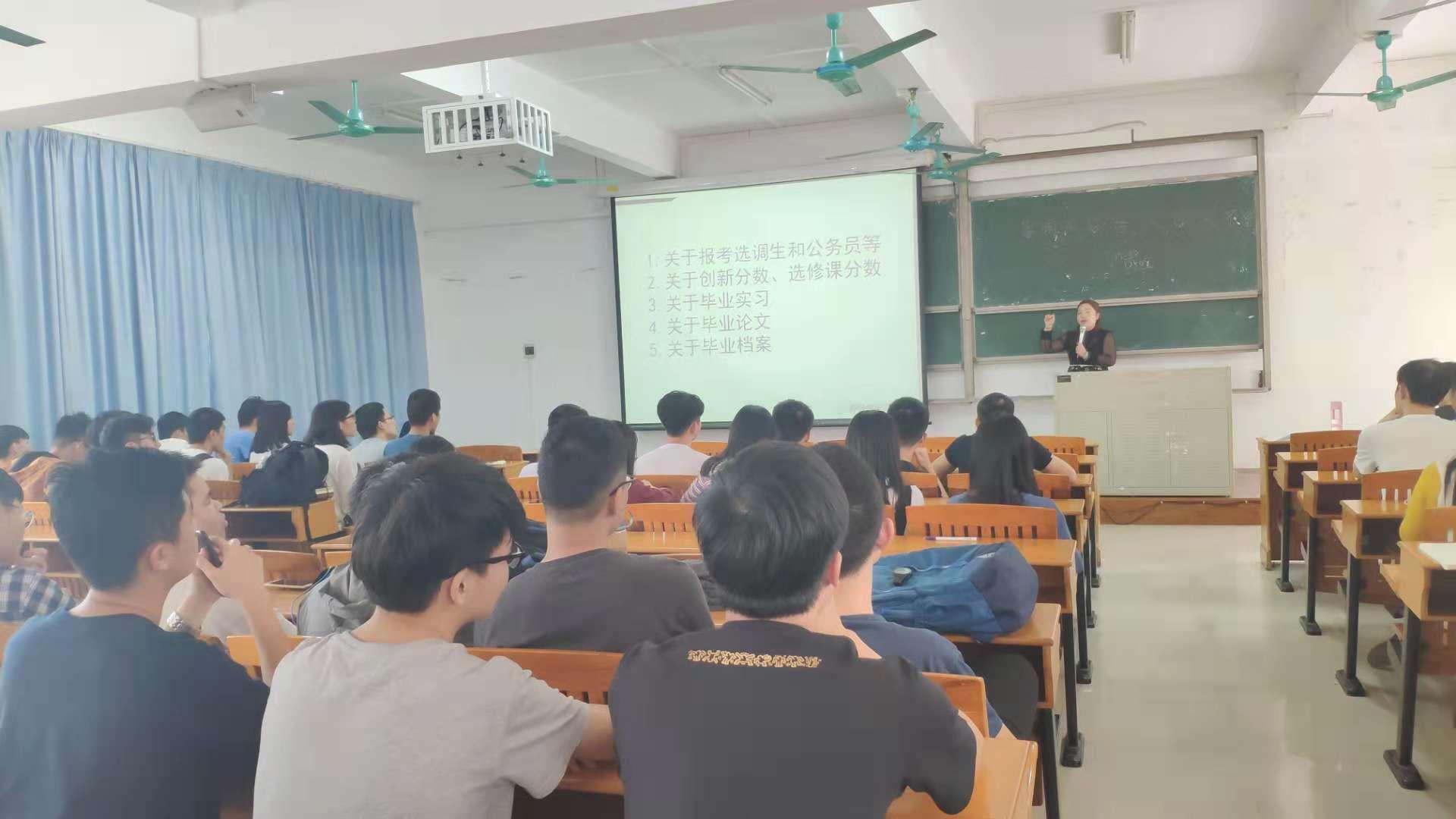 会议开始,郭肖明副书记为毕业生们说明近期正在热报的选调生和公务员的区别,还讲解了关于参加选调生、公务员和“三支一扶”等项目报名和考试的一些基本常识。郭肖明副书记在会上鼓励同学们踊跃报名,尤其是应届党员毕业生,到人民最需要的地方,服务基层,体现党员先锋模范作用,实现人生价值。随后,她概括地介绍了毕业流程及常规操作,同时提醒毕业生保持通信畅通,根据学校和学院要求按时完成毕业论文的撰写和提交。