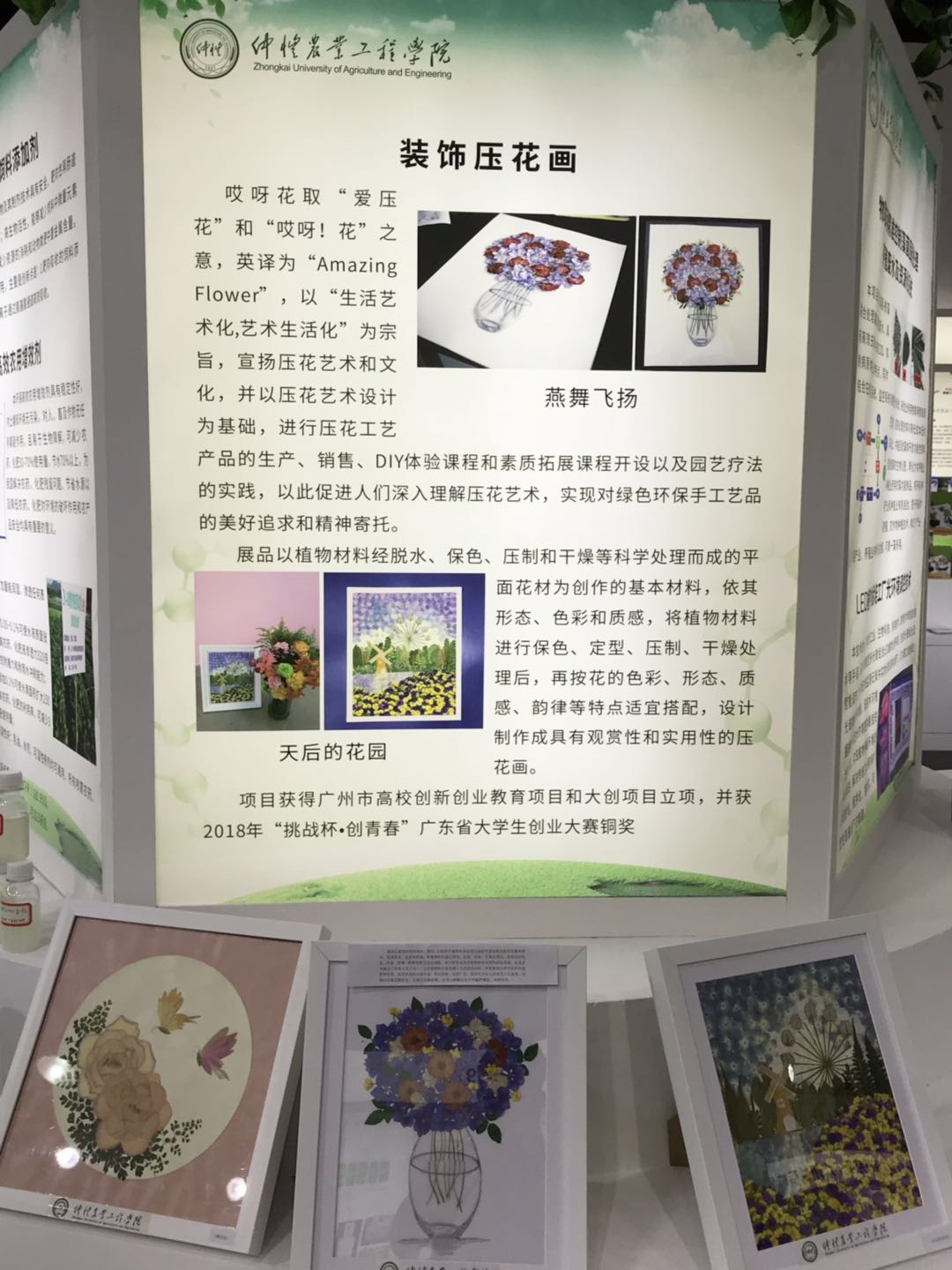 此次博览会以“粤字品牌·美好生活新坐标”为主题,宣传展示我省实施乡村振兴战略、推进农业供给侧结构性改革取得的新成果,组织开展的“一村一品、一镇一业”特色农产品营销展览会。本届农博会组织约40个团组参展,分为5个展区,分别为综合展示及现场活动区、专业展区、名牌展区、地市展区和交流合作展区。其中,综合展示区集中展示广东省农村改革开放40周年,尤其是党的十八大以来广东现代农业发展的综合成就;专业展区包括农业创新馆、农业产业园馆、农业金融馆、渔业馆、扶贫馆、名茶馆、粤菜师傅馆、采购商馆、农民专业合作馆。另外还有21个地级以上市展示区组成的地市展区,以及交流合作展区。农业创新馆区域设有我校的展位,展示了学校近年来的农业新技术成果和产品设施。我院“哎呀花”工作室的压花艺术画吸引了许多观众的驻足欣赏。