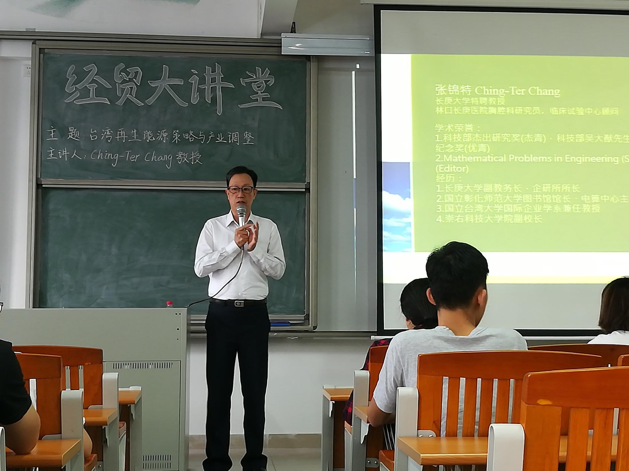 为了增进同学们对能源策略与产业关系的了解,如何将研究成果为政府作决策提供建议,12月6日下午,曾任长庚大学副教务长、企业所所长的张锦特教授莅临D栋综合教学楼610室举办了主题为“台湾再生能源策略与产业调整”的讲座。讲座主办方是经贸学院、农林经济管理重点学科团队和现代农产品流通科技创新团队,出席讲座的有促成此次讲座的何香凝艺术设计学院翟橙老师及经贸学院傅晓副院长、相关老师和学生。