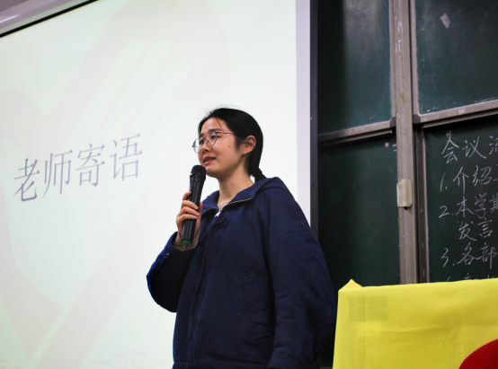 会议开始,刘姝利老师以青协本学期所做的工作为主题展开,刘老师不仅肯定了青协各部门在本学期所付出的爱心,还希望各位成员在做志愿活动的过程中能够满怀热情、不惧困难,发挥当代大学生的责任与担当。刘老师的一席话对青协各成员起到了鼓舞的作用,赢得了大家热烈的掌声。