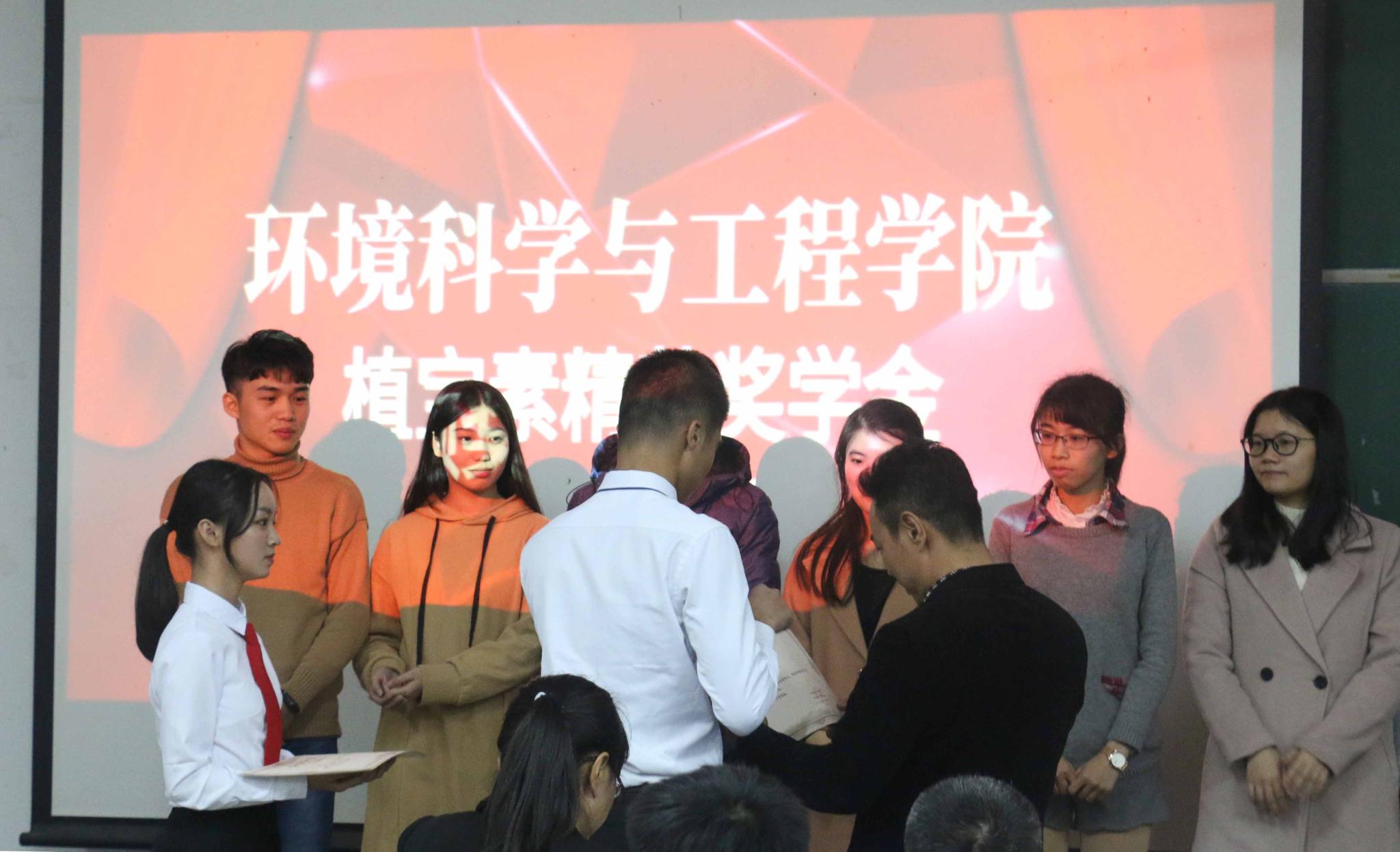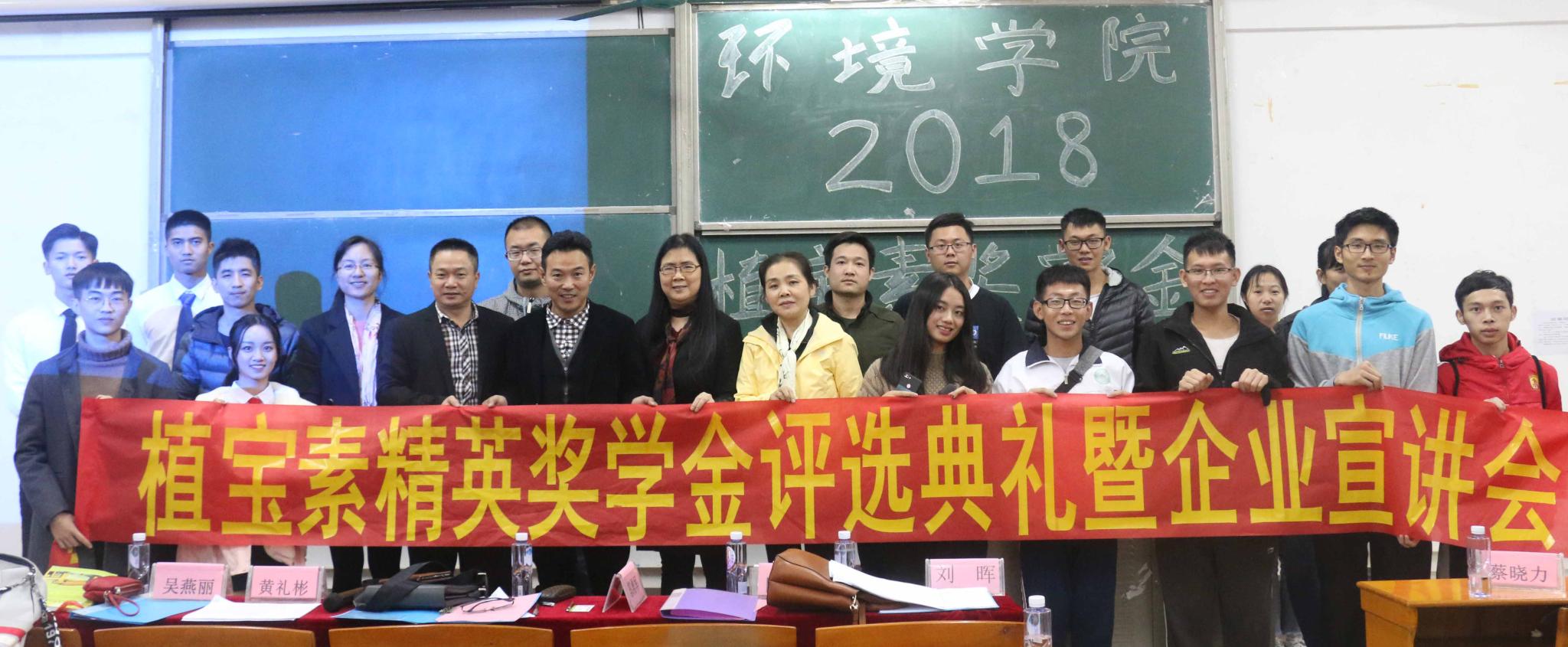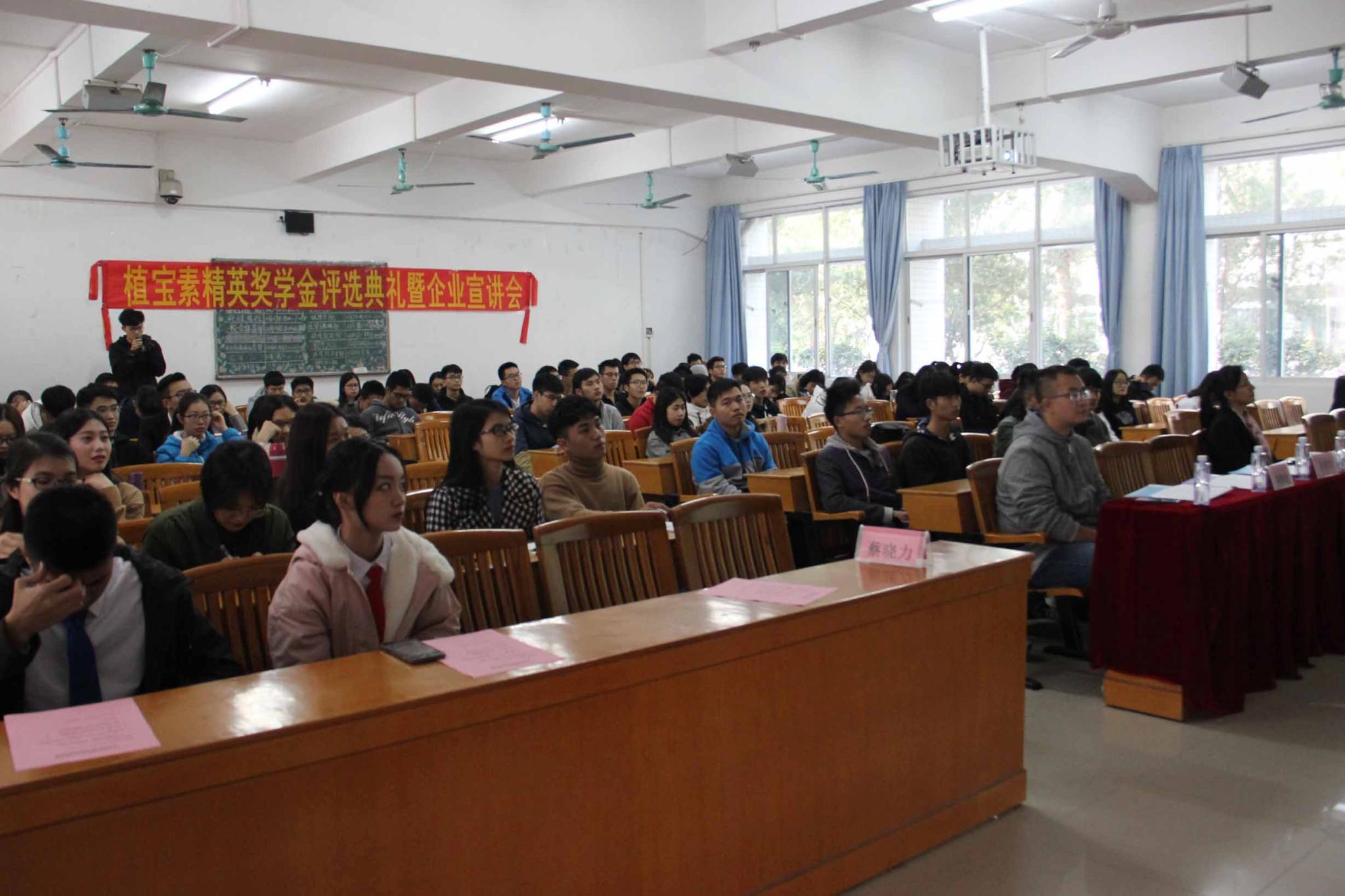 校企合作共培养,学霸精英聚一堂。为进一步加强校企合作与交流,促进学校精英人才培养,12月28日下午,佛山市植宝生态科技有限公司总经理郭勇军、行政部负责人陈敏玫、销售部负责人陈作豪一行专程来到学校白云校区,参加2018年植宝素精英奖学金评选、颁奖典礼暨企业宣讲会,鼓励表彰学习成绩优异、实践能力突出的优秀学生,宣讲企业基本情况、生产经营理念和招聘计划。环境科学与工程学院党总支黄礼彬书记、吴燕丽副书记、刘晖副院长、辅导员蔡晓力老师及学生代表逾百人参加了本次活动。