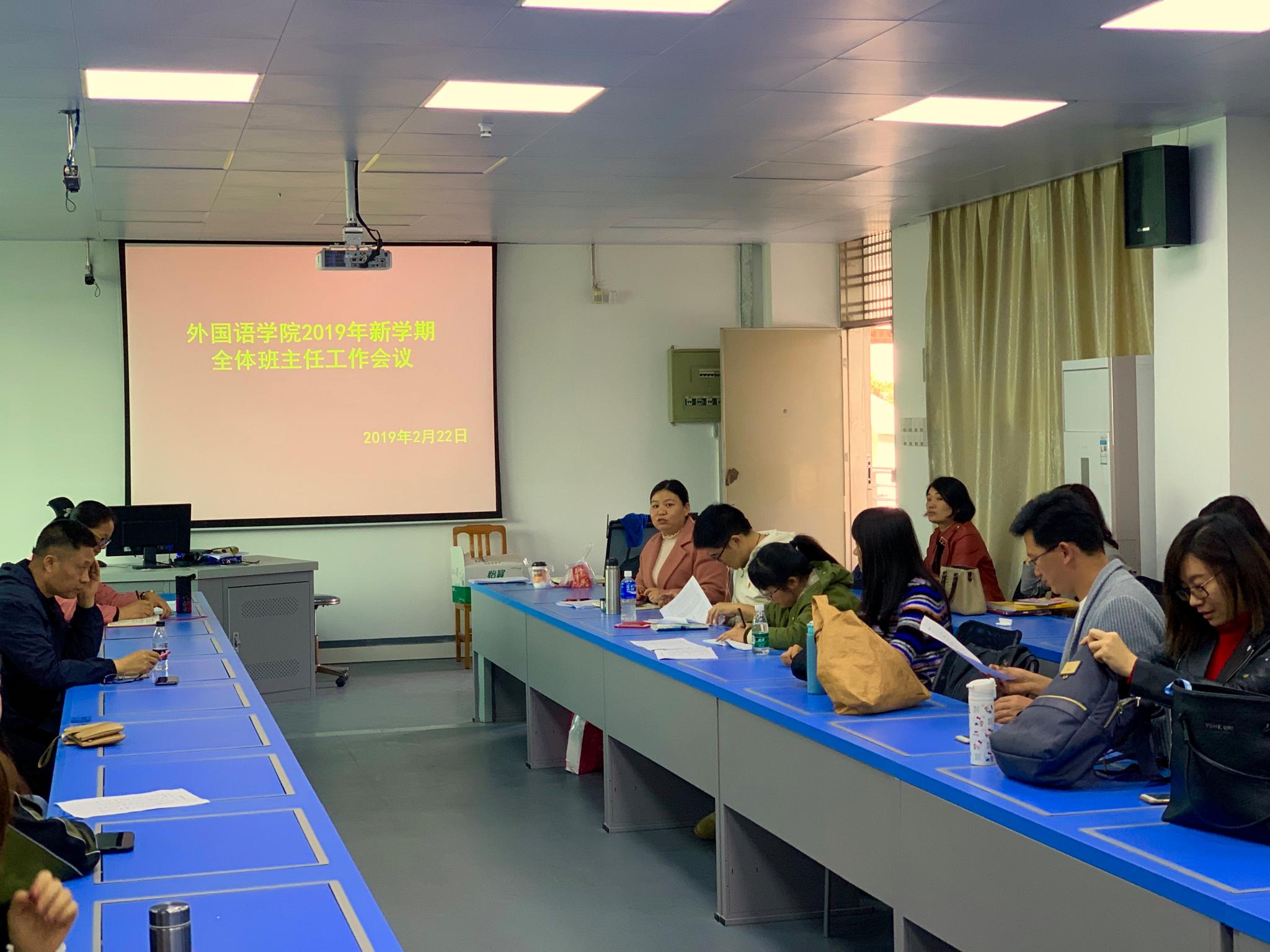 2月22日下午,外国语学院在海珠校区教学楼703语音室召开2019年新学期班主任工作会议。会议由学院党总支副书记柴明勤主持,学院党总支书记吴小玲、辅导员以及全体班主任参加会议。