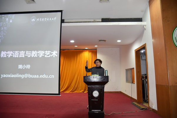 姚小玲强调“以生为本”,从教学理念、教学语言和教学艺术三个方面分享教学心得。她着重阐述了教学语言对于站稳讲台的重要性,分别介绍了课堂教学中的有声语言、非有声语言及教师仪态,并借助课堂教学案例,讲解教学艺术的应用技巧。