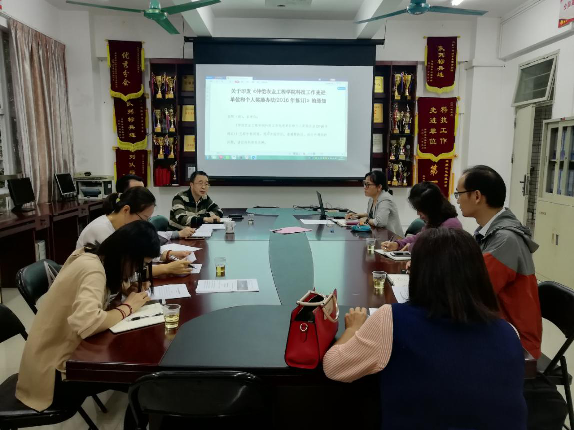 马稚昱副院长汇报了4月10日学校科技工作会议的相关精神,并对《广东省人民政府关于印发进一步促进科研创新若干政策实施的通知》