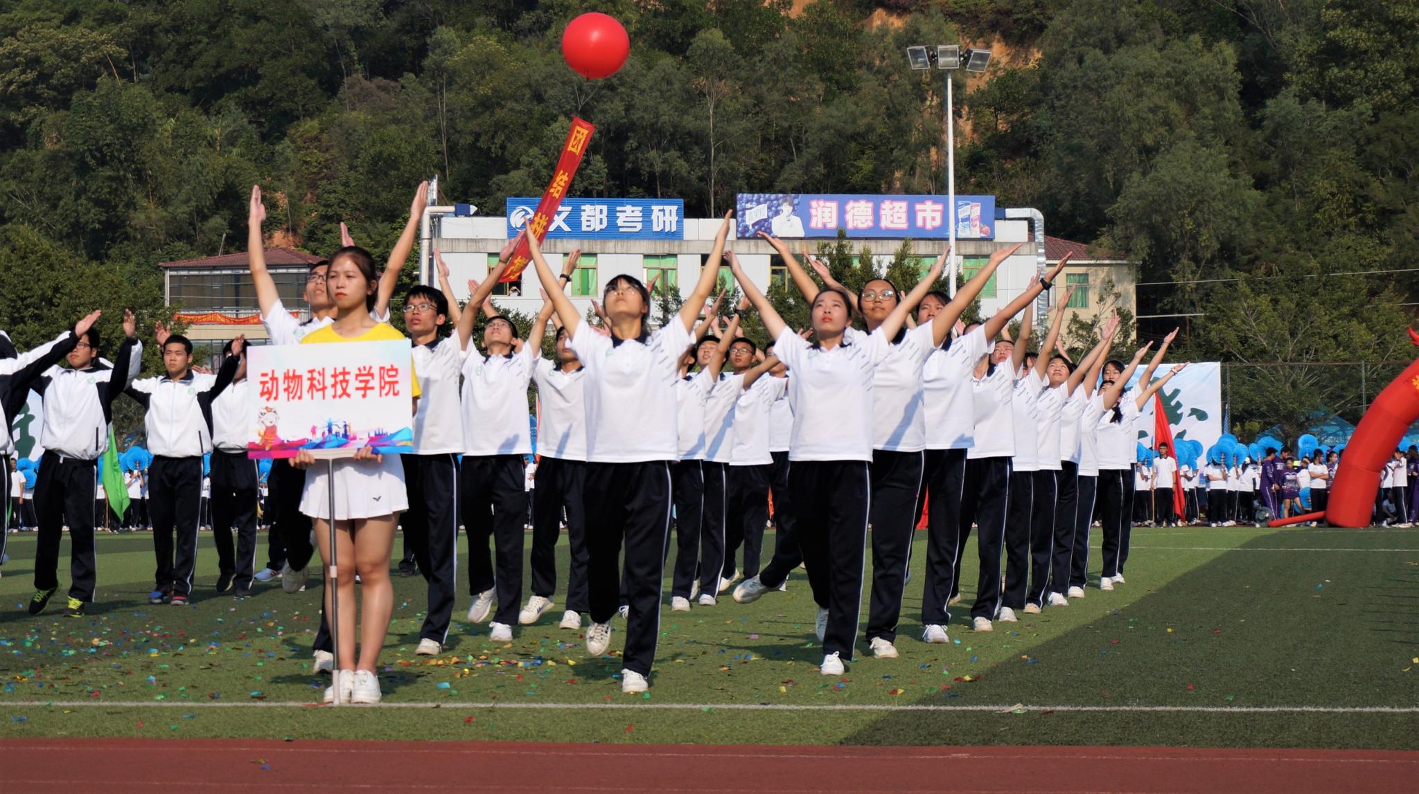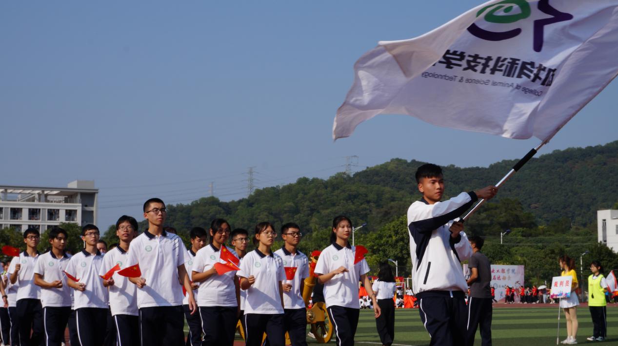 运动会开幕式第一部分是各院代表团入场式,我院方阵统一身着校服手持国旗,精神抖擞地齐步走过主席台,充分展现出我院师生的精神面貌。入场完毕后,仲恺农业工程学院党委书记宋垚臻对此次运动会致辞,希望同学们发扬团结拼搏的精神,在校运会中取得优异成绩。随后开始“第九套广播体操”比赛,我院同学们为了这次比赛训练月余,他们动作整齐,活力四射,展现出动物科技学院的风采。