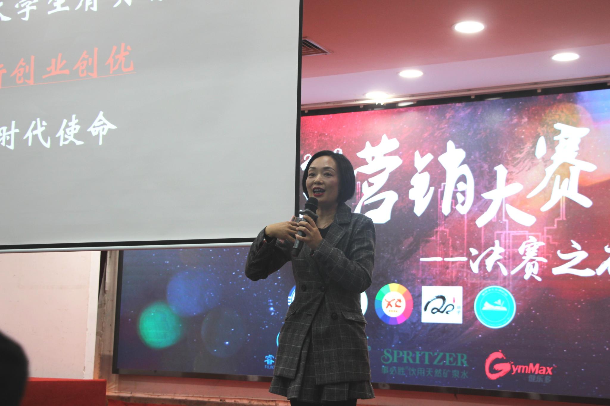 参赛队伍讲解完毕后,杜晓虹给全场选手与观众进行培训。她采取与现场观众进行互动的形式,讲解了“修身齐家治国平天下”的含义,强调阐明了“营销卖的其实是自己”这一观点,并指出现代大学生肩负着创新创业创优的时代使命。