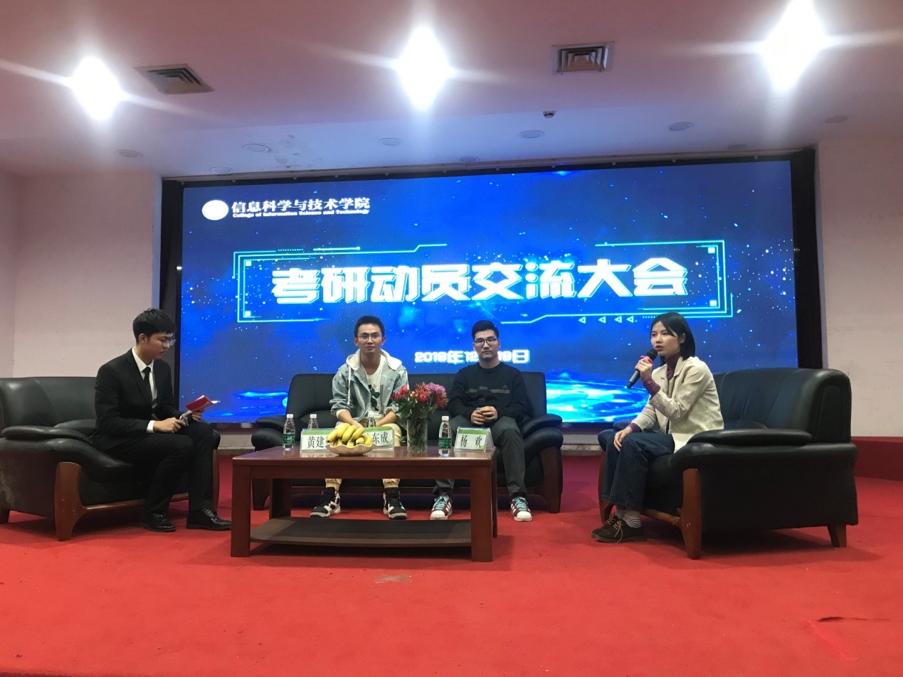 12月19日晚,信息科学与技术学院在学术报告厅举行了考研动员交流大会,大会主要面向17、18级学生。2019届校友、考研优秀学生代表赖东成、杨欢、黄建德分享了考研心得。