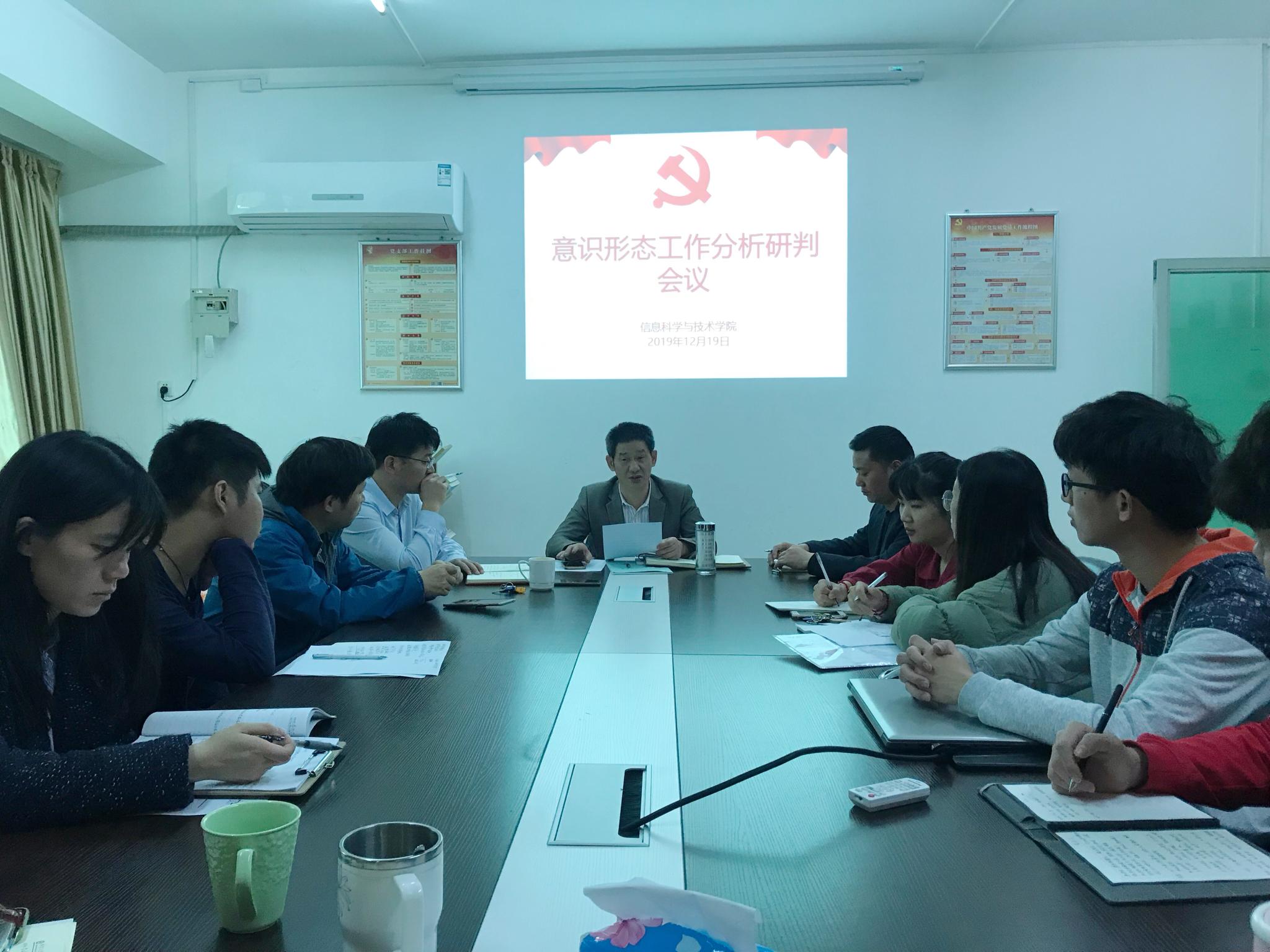 为了进一步落实学校意识形态工作部署,12月19日,信息科学与技术学院召开了第四季度意识形态工作分析研判会。学院领导班子,党支部书记,辅导员及学生干部代表参加了会议,吴家培书记主持了会议。