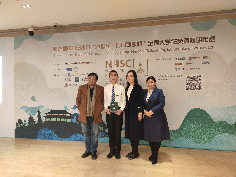 2019年12月21日下午,第二十五届中国日报“21世纪·可口可乐杯”全国英语演讲比赛广东赛区决赛于中山大学举行,我校外国语学院商务英语专业冯榕超参加比赛,并荣获三等奖。外国语学院院长李磊教授、党总支副书记柴明勤、商务英语系王菁老师亲临现场观看比赛。