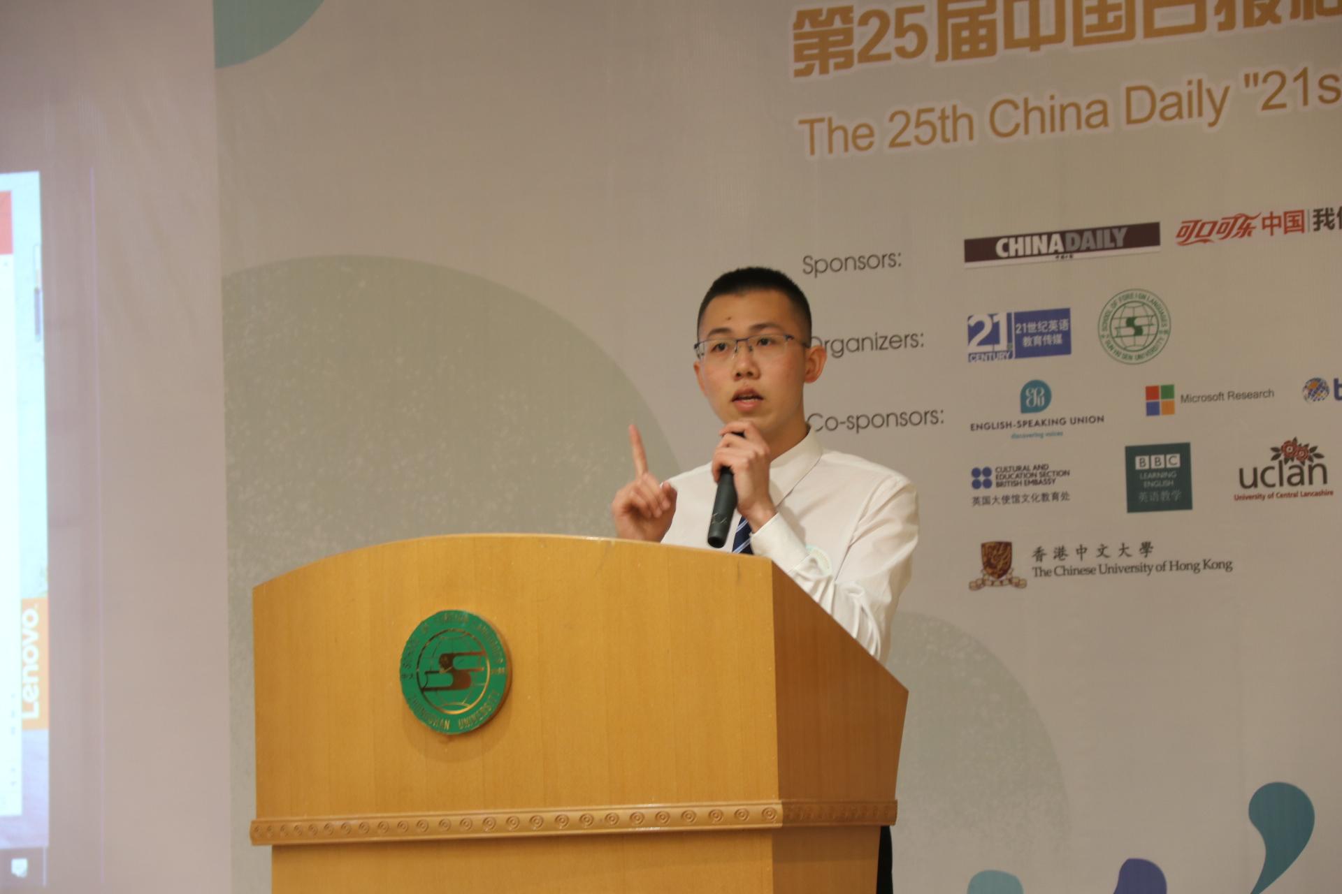 进入此次决赛的选手共有19名,分别来自中山大学、华南理工大学、暨南大学等十多所高校。比赛现场选手们均使出浑身解数,各抒己见。比赛中,冯榕超同学发音自然,表达观点流畅,冷静回应评委提问;最终荣获广东赛区三等奖。