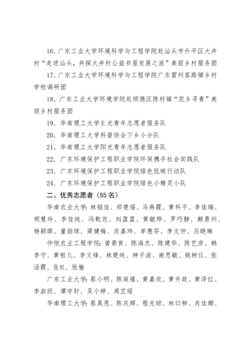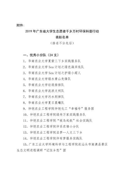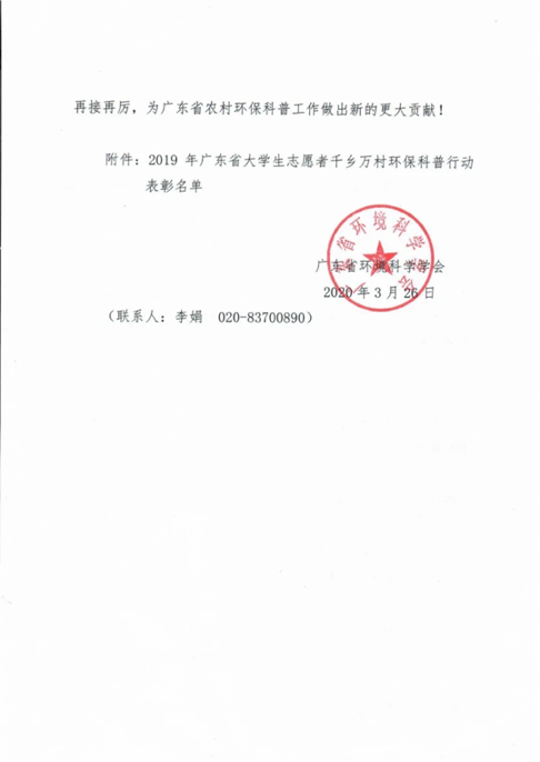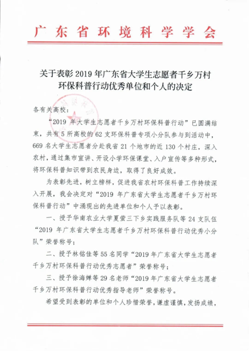 3月26日,广东省环境科学学会公布了《关于表彰2019年广东省大学生志愿者千乡万村环保科普行动优秀单位和个人的决定》,我校仲恺化工“幸福号”服务团、绿传万家实践服务队、“候鸟起航”社会实践队、仲系农情小分队、启梦——人文三下乡、仲有梦服务实践队共六支队伍获得“优秀小分队”称号;李博等10位教师获得“优秀指导老师”称号;曾景育等15位同学获得“优秀志愿者”称号。