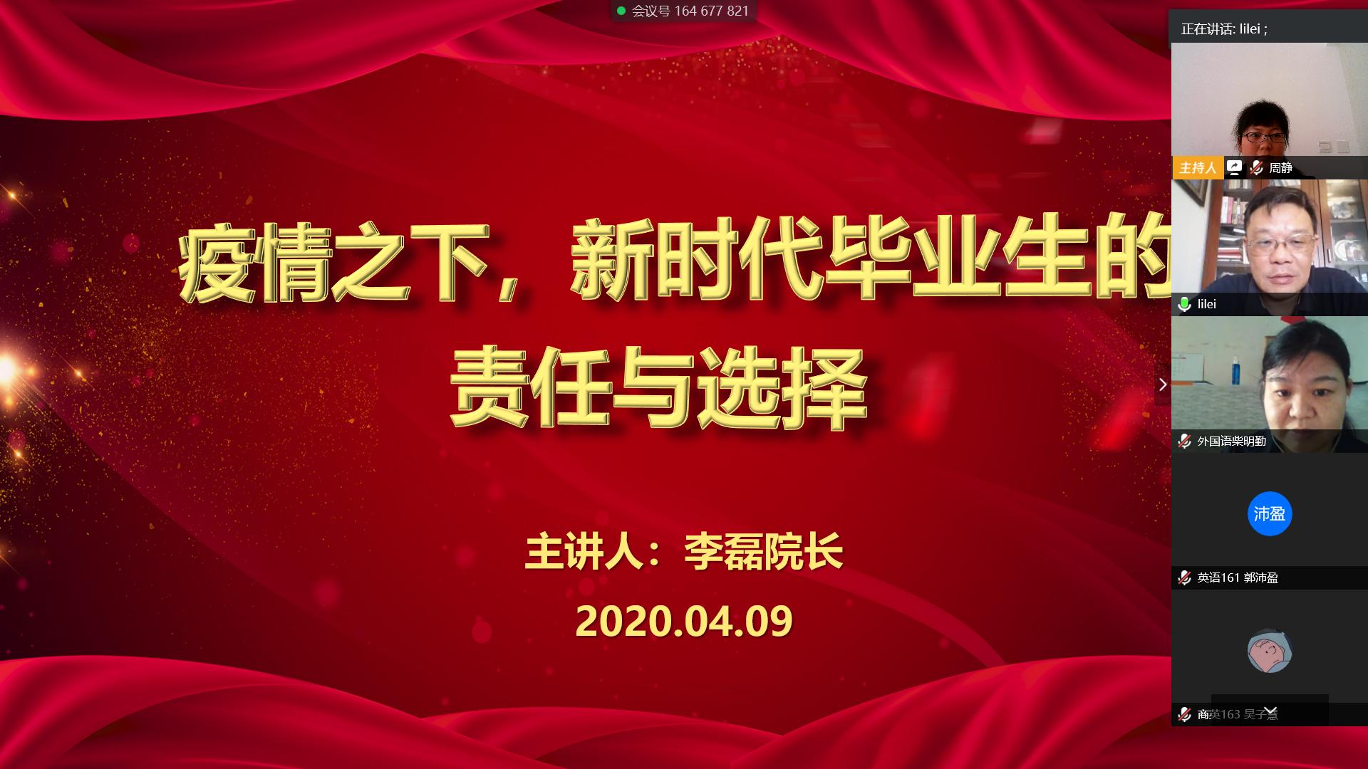 自新冠肺炎疫情发生以来,我国就业形势愈发严峻。为更好地帮助毕业生理解特殊时期自己身上的责任和选择,4月9日上午,外国语学院就业服务中心特邀请李磊院长在腾讯会议平台上给毕业生带来了一场毕业生如何应对疫情的思政课。出席本次思政课的有外国语学院院长李磊、外国语学院党支部副书记柴明勤、外国语学院辅导员周静、以及外国语学院毕业班同学等。