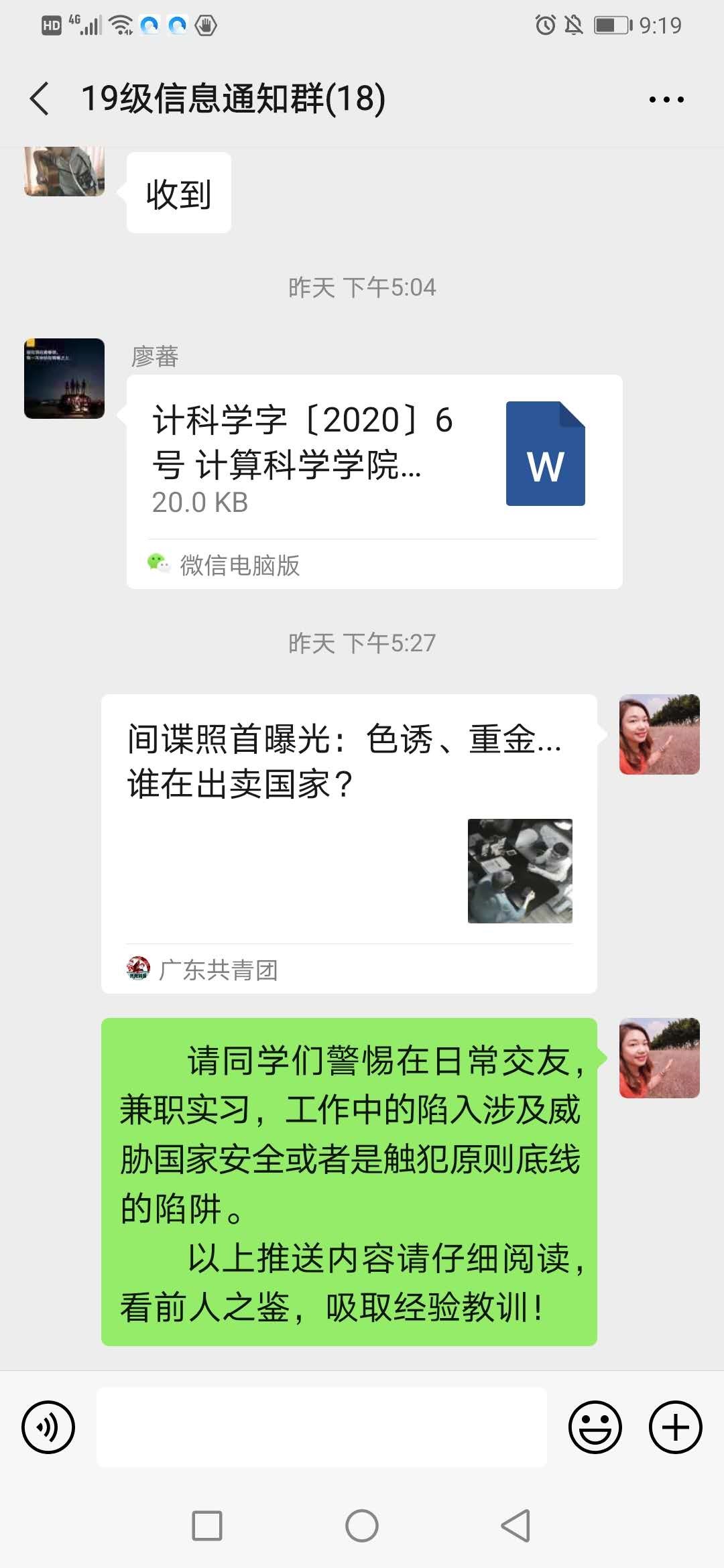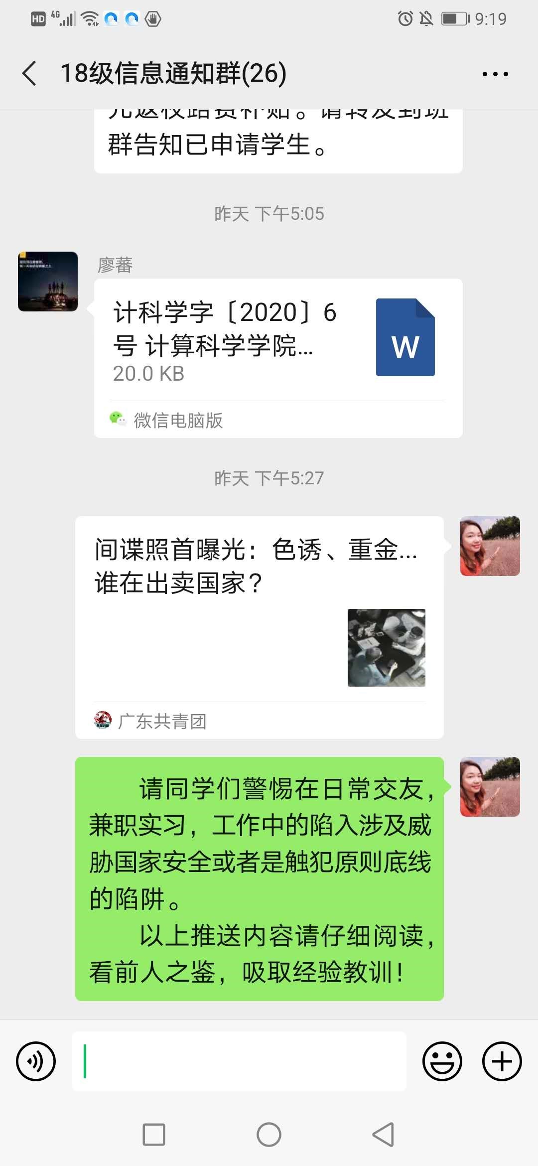 学院教师在年级班干群分享国家安全教育相关内容推送,加以引导,强调作为青年大学生要维护国家安全,致力守护共同的家园。