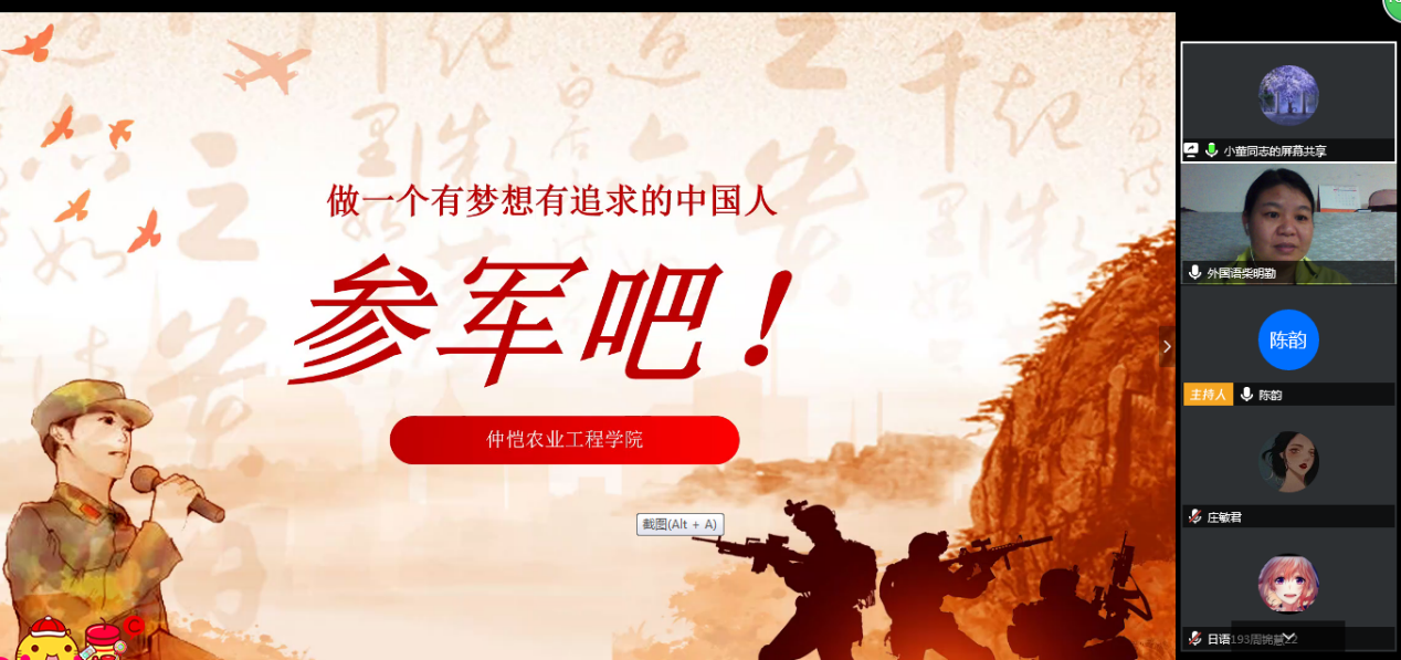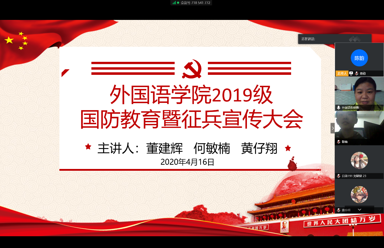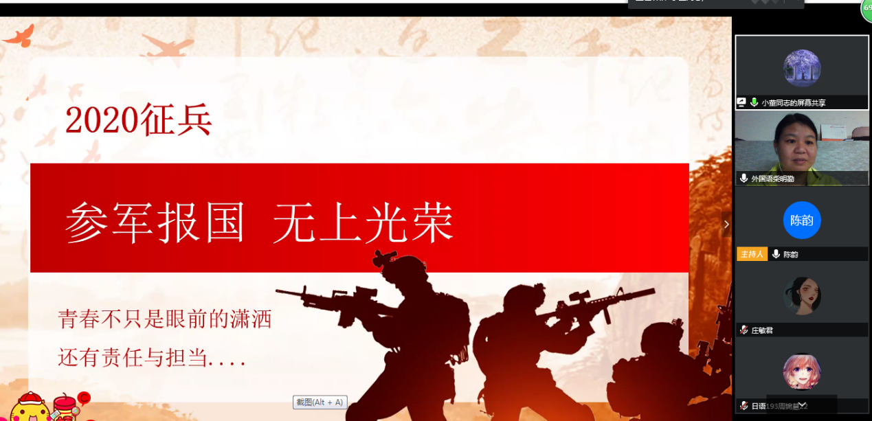 为使外院学子深入了解军旅生活,加强征兵政策的宣传力度,鼓励学生积极参军入伍,4月16日晚,外国语学院于腾讯会议平台举办2019级国防教育暨征兵宣传会。出席本次宣传会的有外国语学院党总支副书记柴明勤、辅导员陈韵,我校优秀退伍大学生会展192班董建辉、国贸172何敏楠、化工181黄仔翔受邀参加宣传会,2019级全体学生参加会议。会议由陈韵主持。